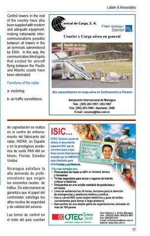 de capacitación se realiza en el centro de entrenamiento del fabricante del radar, INDRA, en España y en la prestigiosa academia de vuelo PAN AM en Miami, Florida, Estados Unidos. Nicaragua satisface la alta demanda de profesionalismo que exigen los crecientes niveles de tráfico. De esta manera se garantiza que el papel del controlador satisfaga los altos niveles de seguridad y de calidad del servicio. Las torres de control en el resto del país cuentan 17
