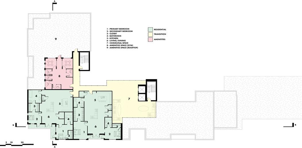Inviting both residents and visitors to engage with the site and surrounding urban areas. This open area serves as a welcoming plaza, encouraging interaction and fostering a sense of community. The ground level programs, including a coffee shop and retail spaces, activate the edges of the building and establish a vibrant connection to the street. The upper levels are organized around the core, with flexible layouts to accommodate residential, social and activity spaces. +