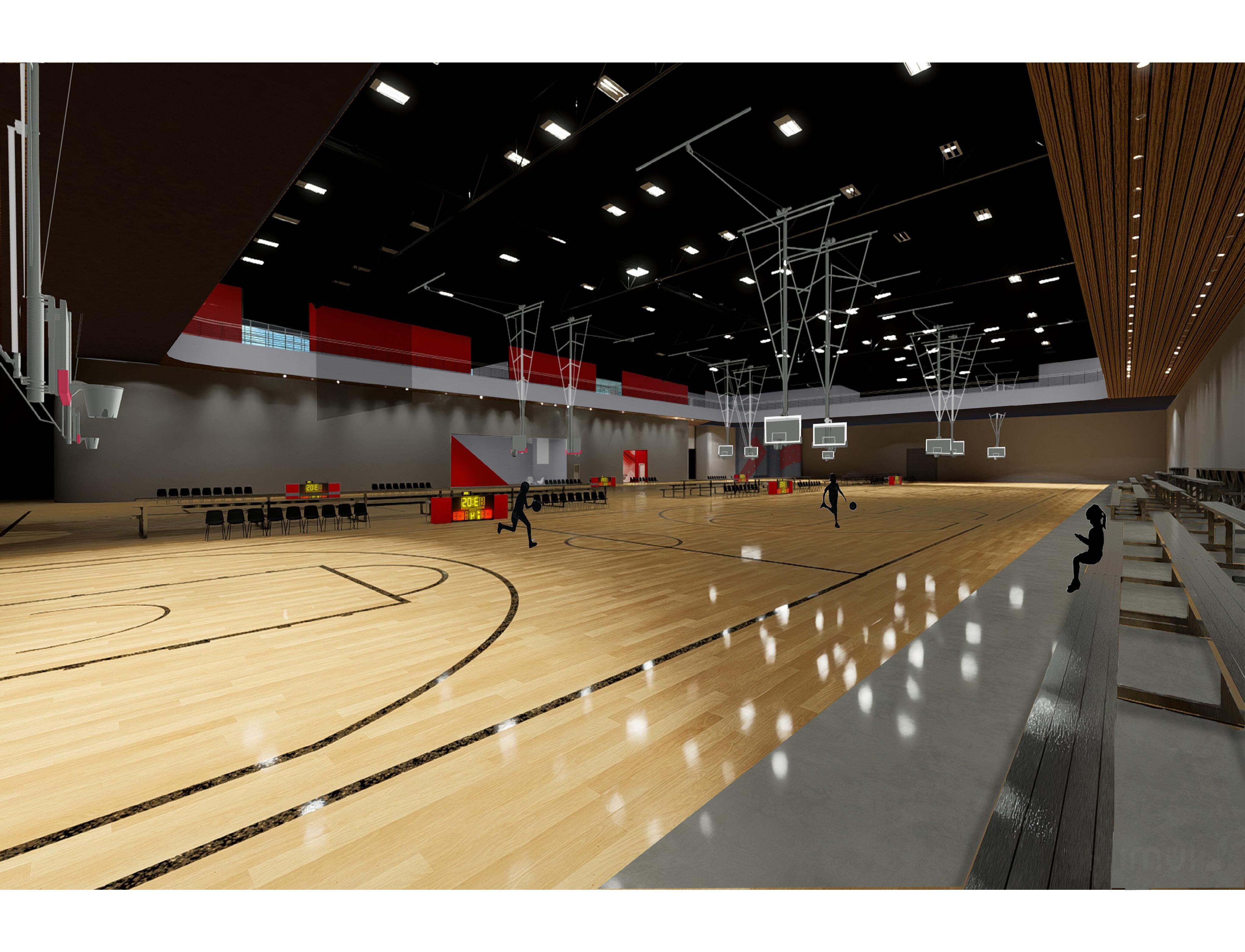 At the back of the gymnasium render, an abstract rock wall adds another layer of activity and engagement. Its irregular, sculpted form continues the theme of movement, encouraging physical exploration while serving as a focal point. The rock wall embodies the fusion of form and function contributing to the gyms dynamic and multifaceted environment.
