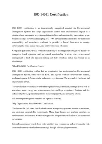 ISO 14001 certification is an internationally recognized standard for Environmental Management Systems that helps organizations control their environmental impact in a structured and measurable way. As regulations tighten and sustainability expectations grow, businessesacrossindustriesareadoptingISO14001certificationtodemonstrateenvironmental responsibility and compliance readiness. It provides a formal framework to manage environmental risks, reduce waste, and improve resource efficiency.