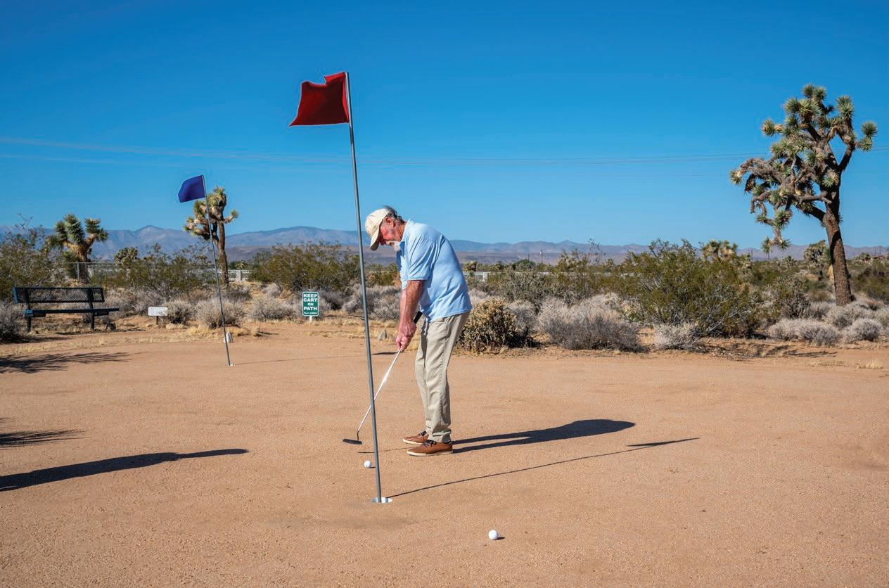 But the soul of the course is native plants in their rugged natural surroundings, witnesses to a blessed frolic on a sunny day. Our shots fly over creosote, ocotillo and yucca. We carefully, politely, walk narrow naturally occurring paths among cholla, buckwheat and chaparral as dozens of towering Joshua’s, all well out of harm’s way, also enjoy the pleasant breeze.