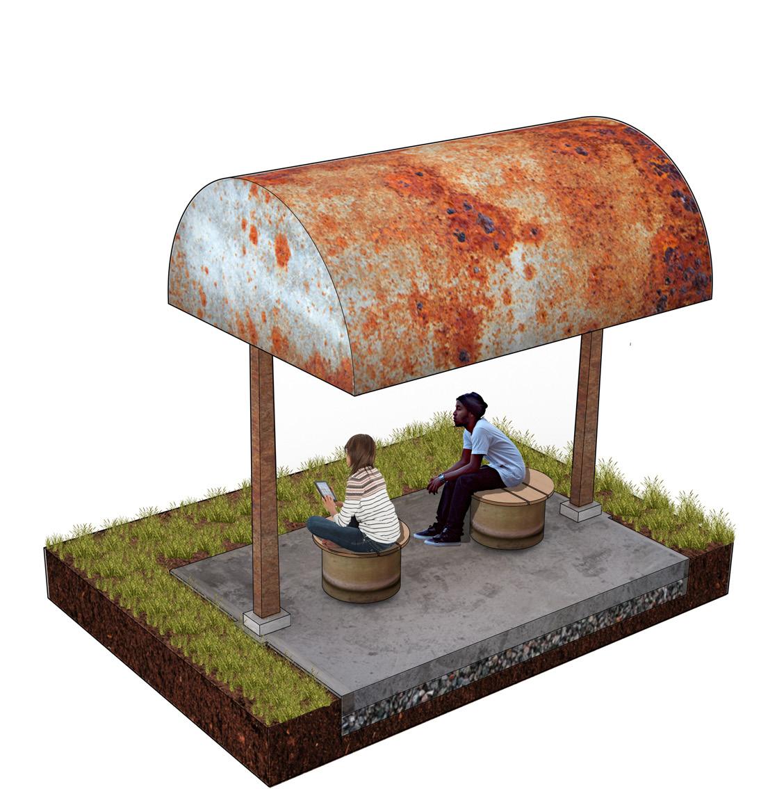 This class project focused on creating a detail-set for an imagined landscape feature. I decided to utilize recycled materials and created a canopy by cutting an oil tank in half. The rotating seats below the canopy utilize smaller recycled oil barrels.