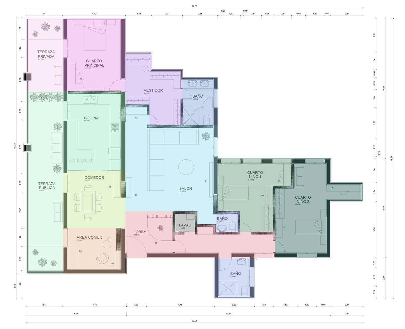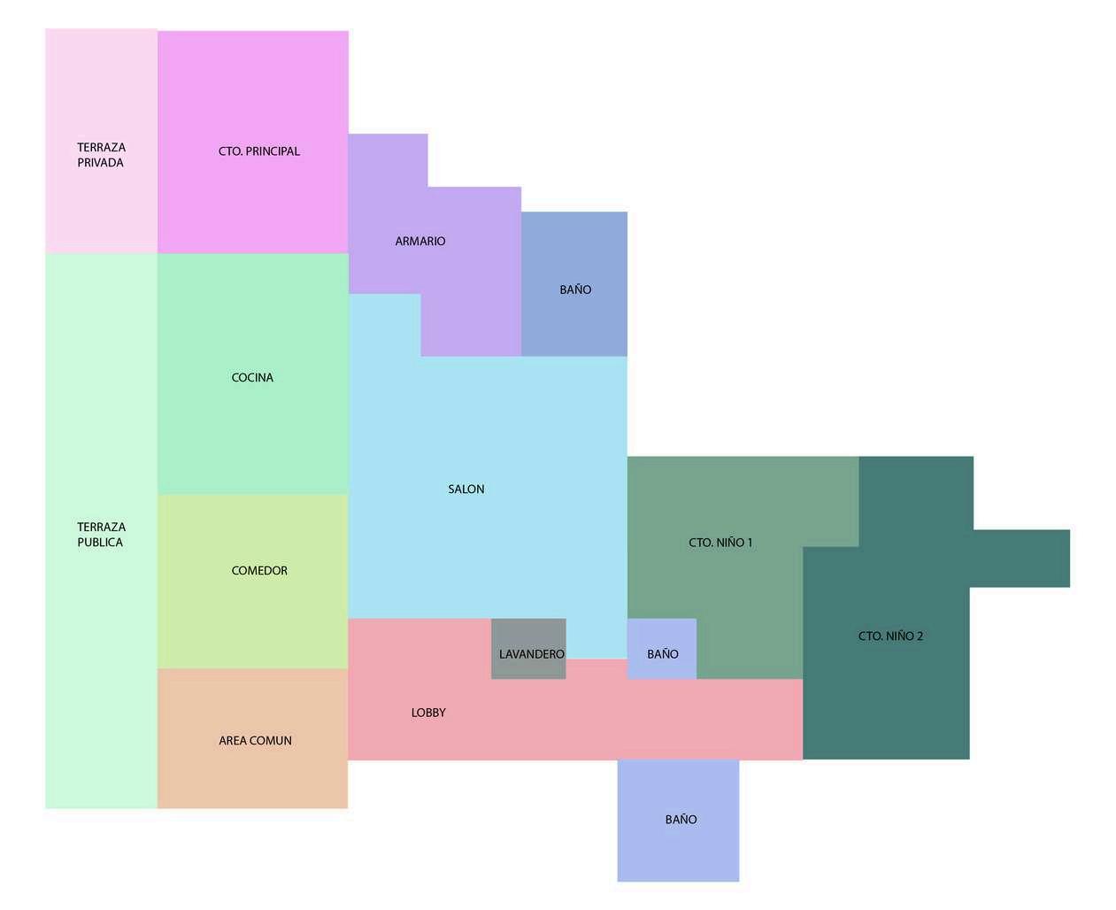 Tal como se observa contamos con un área de lobby tipo núcleo de distribución, que segmenta las áreas entre noche y día, ubicando hacia la derecha las habitaciones de los infantes y hacia la izquierda la sala, comedor y cocina para posteriormente toparse con la habitación principal yuxtapuesta en paralelo hacia las áreas de apoyo privadas.