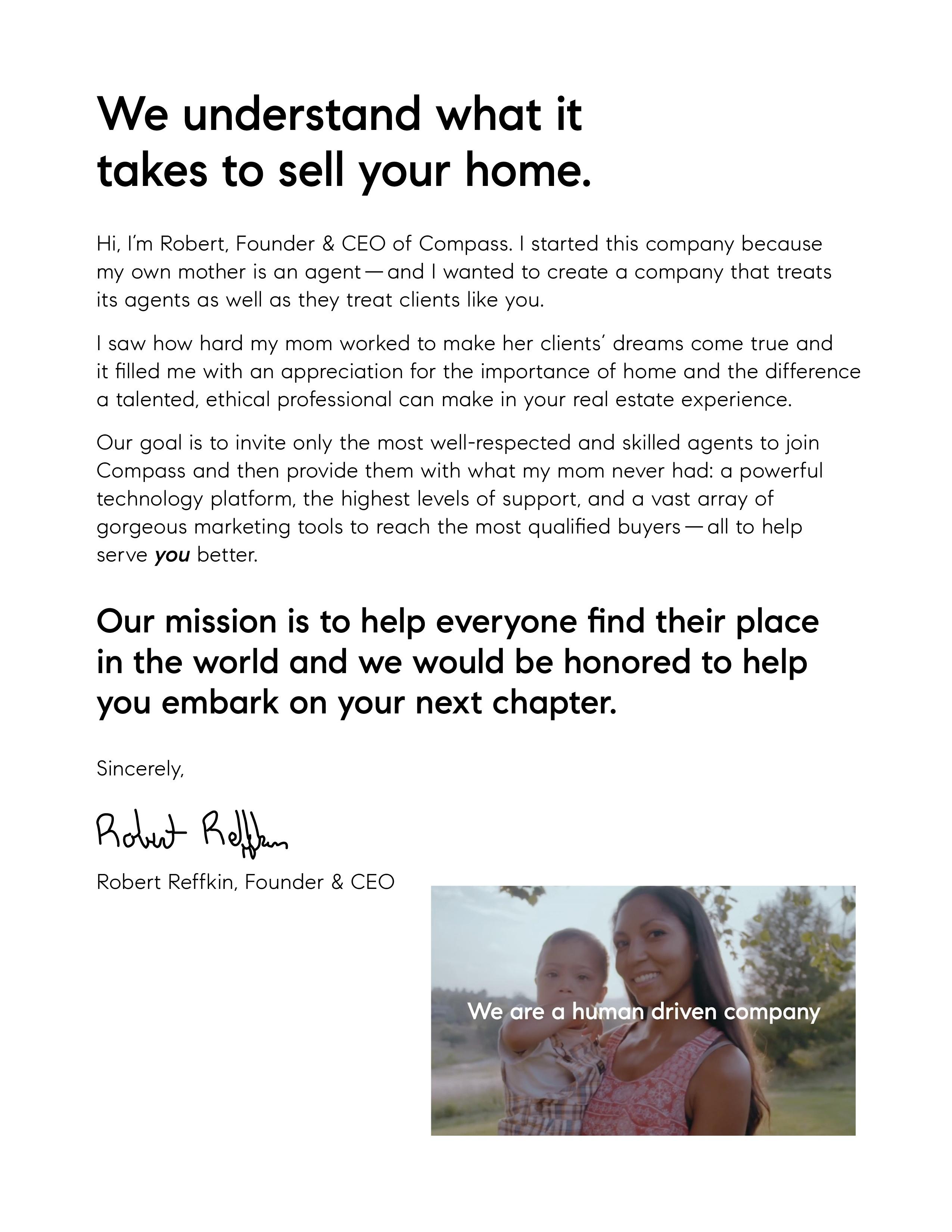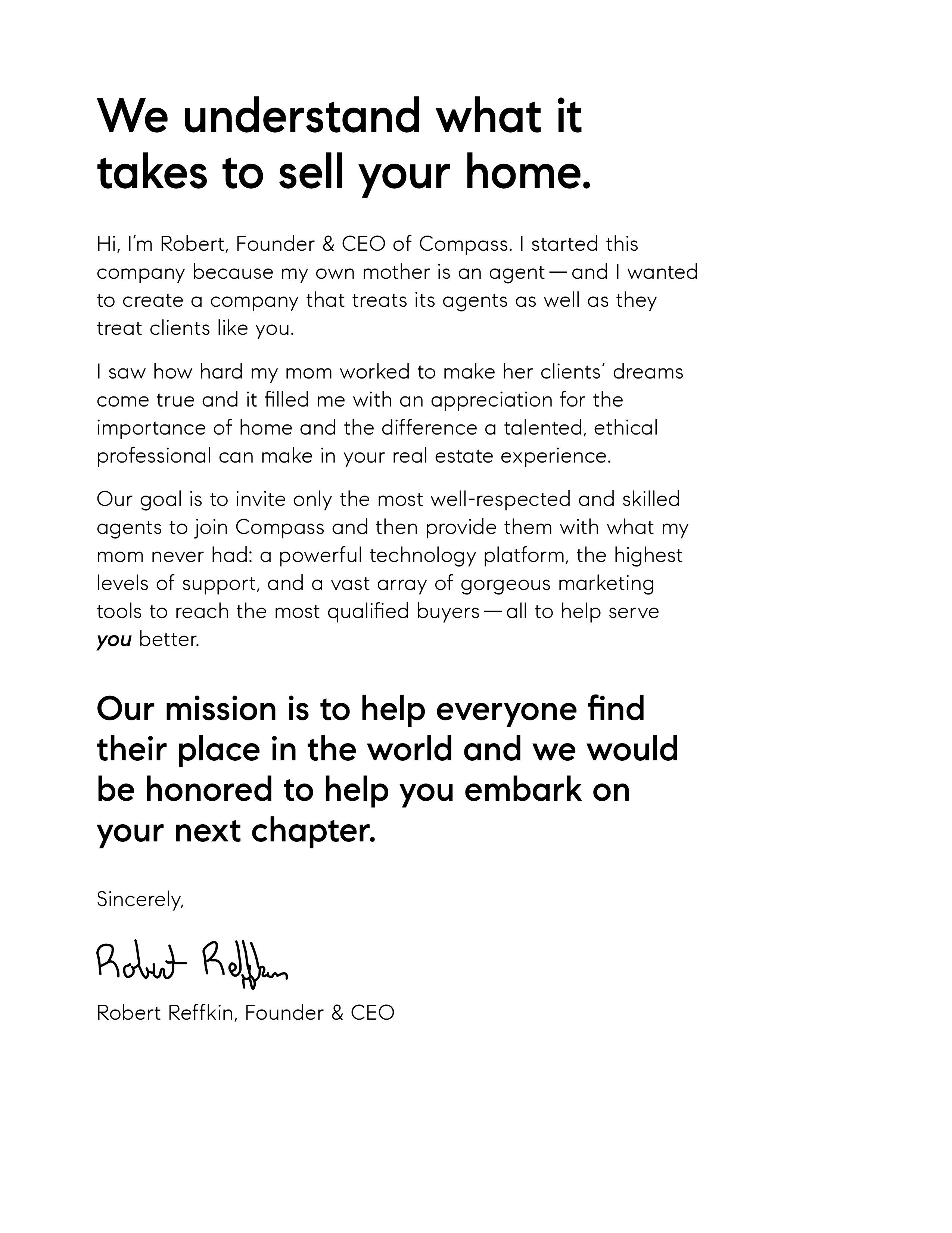 to active** More traffic at an open house*** Data refers to a comparison between MLS and Compass Coming Soon listings vs. listings that go straight to active. *Viewership sourced via Compass.com 1/2020–8/2020. **Days on market sourced via Compass.com 1/2020–7/2020. ***Open house traffic sourced via Compass.com 1/2020–9/2020. Compass Coming Soon and Private Exclusives are subject to local MLS restrictions and not available in all markets. Local policy definitions may restrict how Private Exclusive listings can be shared between agents, even within the same brokerage. Where the programs are available, pre-marketing and listing strategies are independently determined by the client. Compass does not recommend one particular strategy or guarantee results. compass.com/coming-soon compass.com/private-exclusives