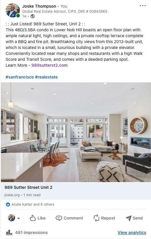 Gracefully matching passionate clientele with distinguished properties takes place in-person and on the internet. Joske’s cohesive social media and listing market strategies are rooted in a deep understanding of the nuances that occue in the SF residential districts in addition to the latest commonplace for business transactions online. Artfully, crafting the message, maximizing reach, and creating competitive advantage by utilizing the latest digital practices continually guides Joske’s clients towards their ideal properties and crucial market information.
