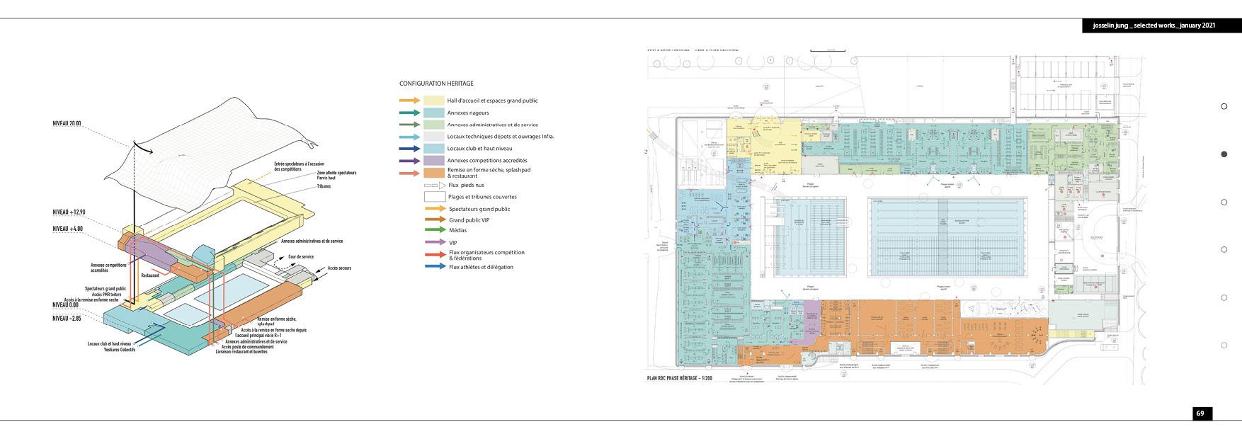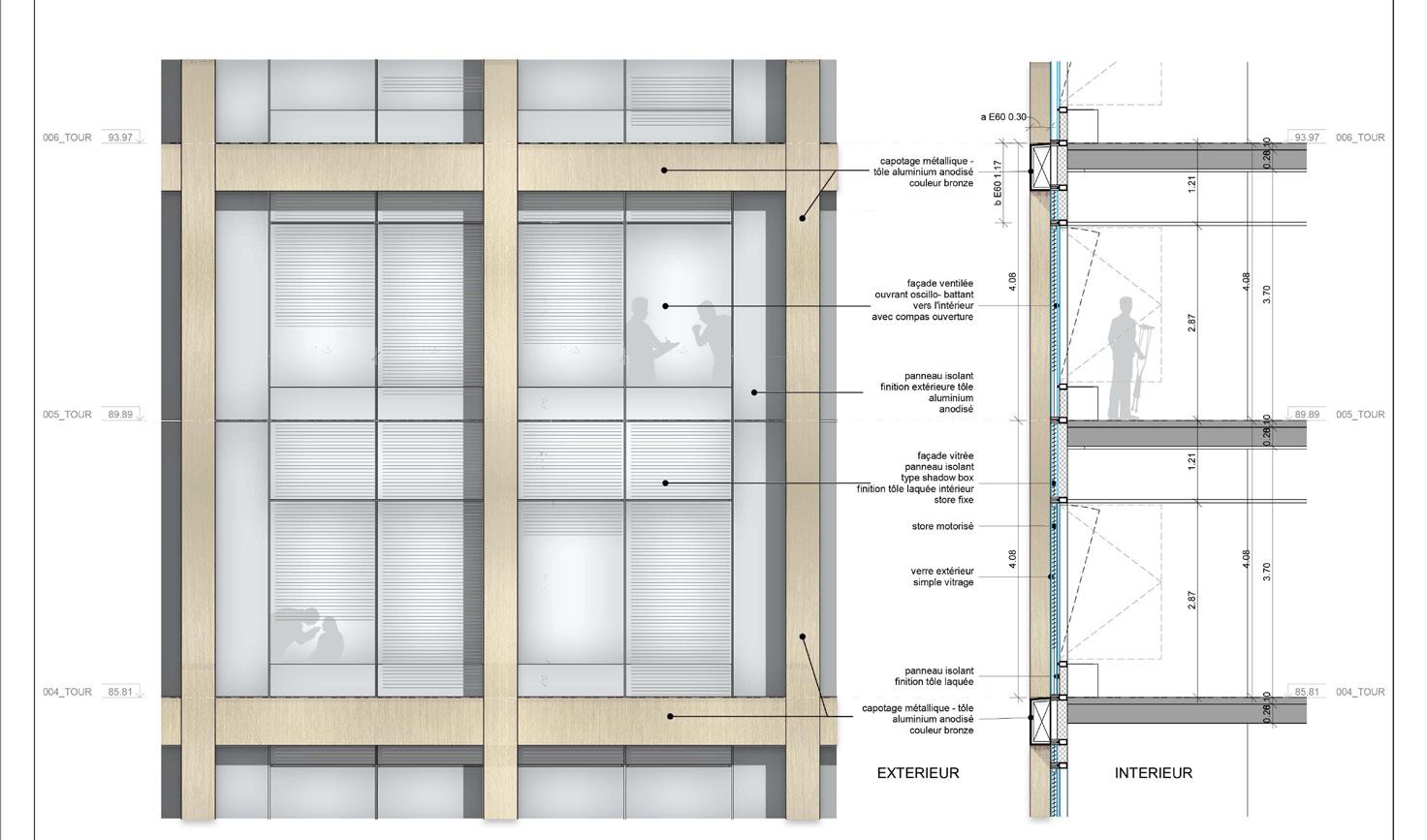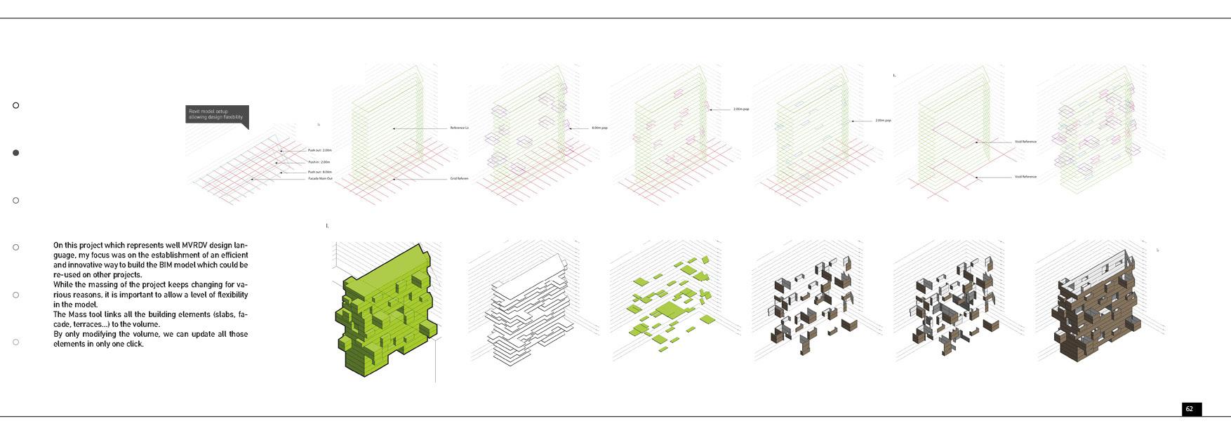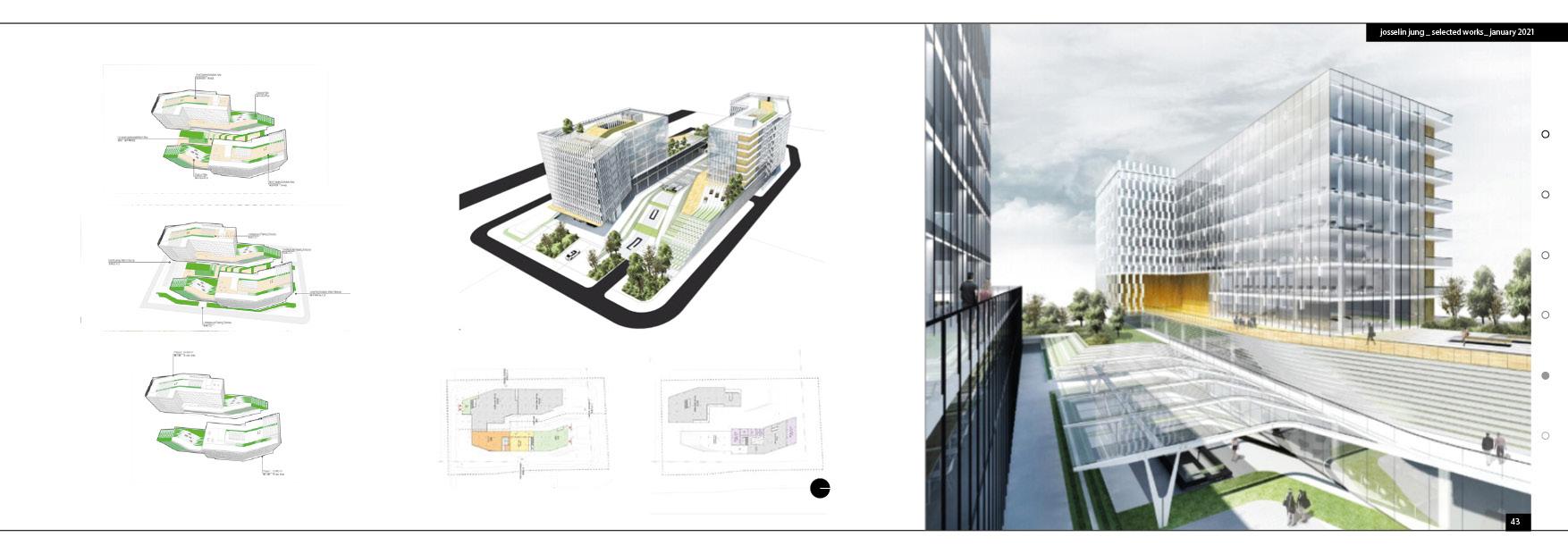 : dPa la stratégie d’organisation fonctionnelle du projet, reposant sur la superposition de 4 lingots quasiment identiques, est très efficace et rationnelle. ce dispositif permet de créer une dynamique sans perturber l’efficacité et la rentabilité des plans. Mon rôle de chef de projet sur la phase aPd consistait principalement à constiuter les booklet d’étude du projet, principalement des façades, en coordination avec les architectes locaux “Hoffmann-janz”. sous la supervision de dominique Perrault et/ou du directeur de projet, j’ai pu constituer les différentes études sur les 3 parties “socle, “fishskin”, et toiture, constituant l’identité du projet.
