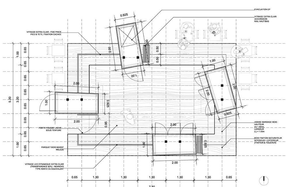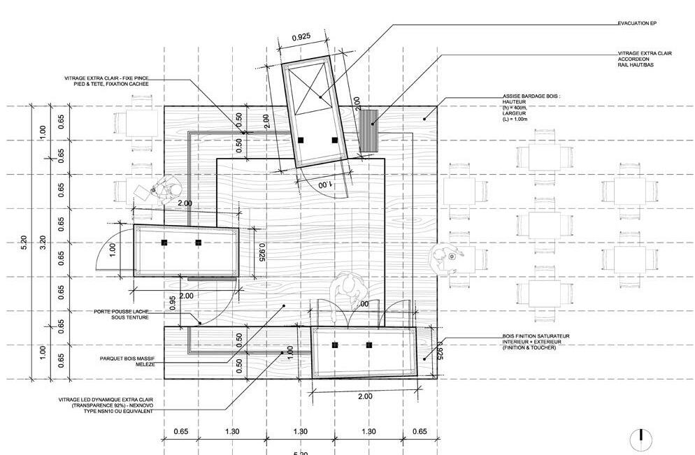 L’organisation fonctionnelle des «Bois Debout», que nous avons appelée software par opposition au hardware du socle commun à toutes les folies, permet de garantir des aménagements différenciés qui répondent aux attentes locales. Par leurs monolithes mobiles, les «Bois Debout» offrent une déclinaison infinie d’agencements, gage de grande flexibilité pour le futur preneur qui pourra ajuster l’ouverture, la surface dédiée à son personnel ou aux visiteurs au plus