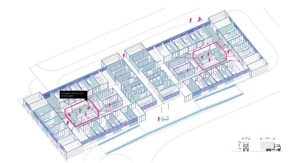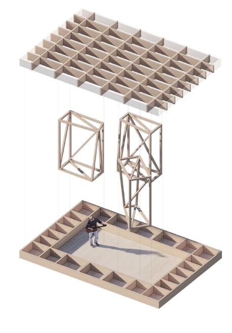 BÂTIMENTS MODULAIRES DITES «LES FOLIES» DANS LE CADRE DU PROJET «LES ALLEES DE NEUILLY» monolithe structure bois socle structure bois toiture structure bois Axonométrie éclatée rille Structurelle & Maillage forain Schéma de trame structurelle Maillage forain 2. Des monolithes, disposés spécifiquement selon les besoins des usagers, assurent la structure porteuse. La densité de la grille de la toiture permet de positionner les monolithes en tout points. monolithes suffisent porter la toiture. Le socle est composé de caissons qui serviront d’assise, de rangements, de faux-plancher pour les fluides et réseaux.