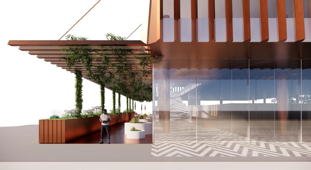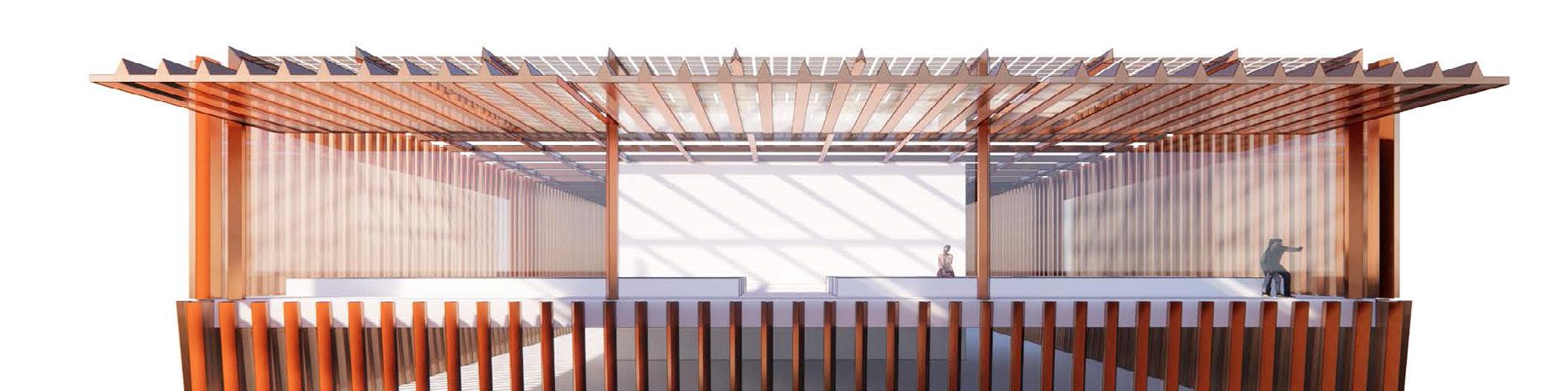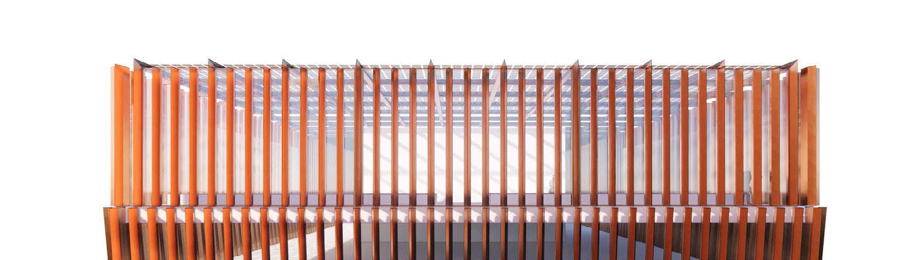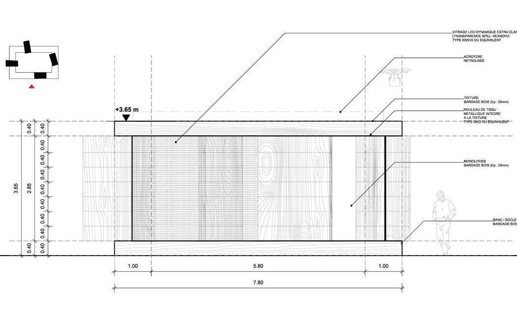 Pour protéger la projet du vandalisme, mais aussi lutter contre l’échauffement solaire, des rideaux de maille métallique pourront être disposés autour du porjet. Ces rideaux seront rangés dans un caisson en sous-face de la toiture, et enroulés autour d’une tringle.