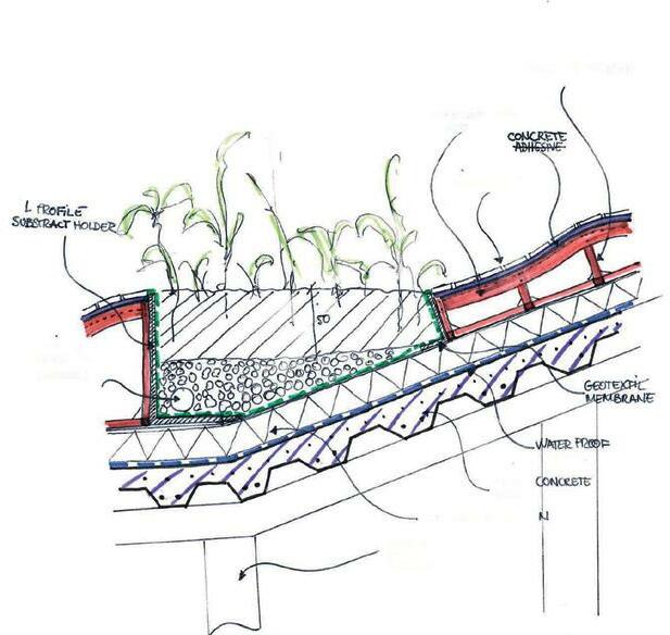 1. Bacs à fleurs 50 % de couverture de toiture 2. ystème de écupération des eaux 3. Gaufrier structurel 4. solant 5. éservoir de récupération intégré dans monolithe 6. ossibilité de lien au réseau d’égoûts