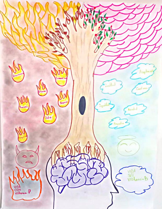 La copa del árbol nos muestra de un lado frutos y hojas, ósea que si nosotros ayudamos a la gente se crearán estas dos cosas en cambio si no ayudas, insultas, golpeas “haces violencia” tus hojas se marchitaran y frutos nunca darán.