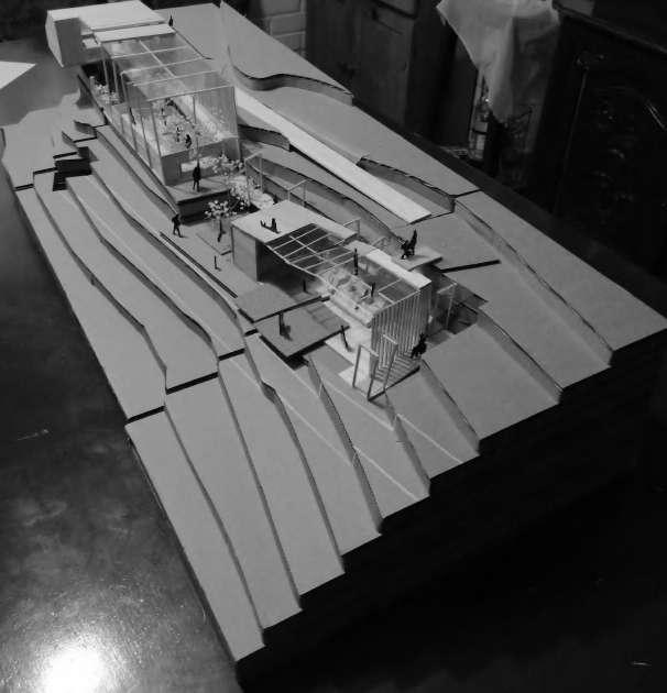torno al recorrido lineal y la posibilidad conecte y al mismo tiempo unifique una composición alargada que llama contemplar el espacio mientras lo recorre, de las rampas, escaleras y pasarelas.