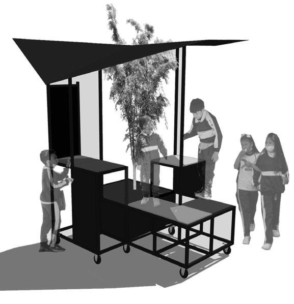 Tomando aquello en cuenta, se llegó al diseño de tres módulos móviles, estos incorporarían el verde por medio de árboles nativos, sembradosenunamacetaqueformapartedelmódulo.Unacubierta irregular que haga alusión a la vista de las montañas y un juego de llenos y vacíos con una malla de 50x50cm que serviría para el descanso o diversión de los usuarios. Asimismo, contiene planos verticcales que pueden ser usados como carteleras.