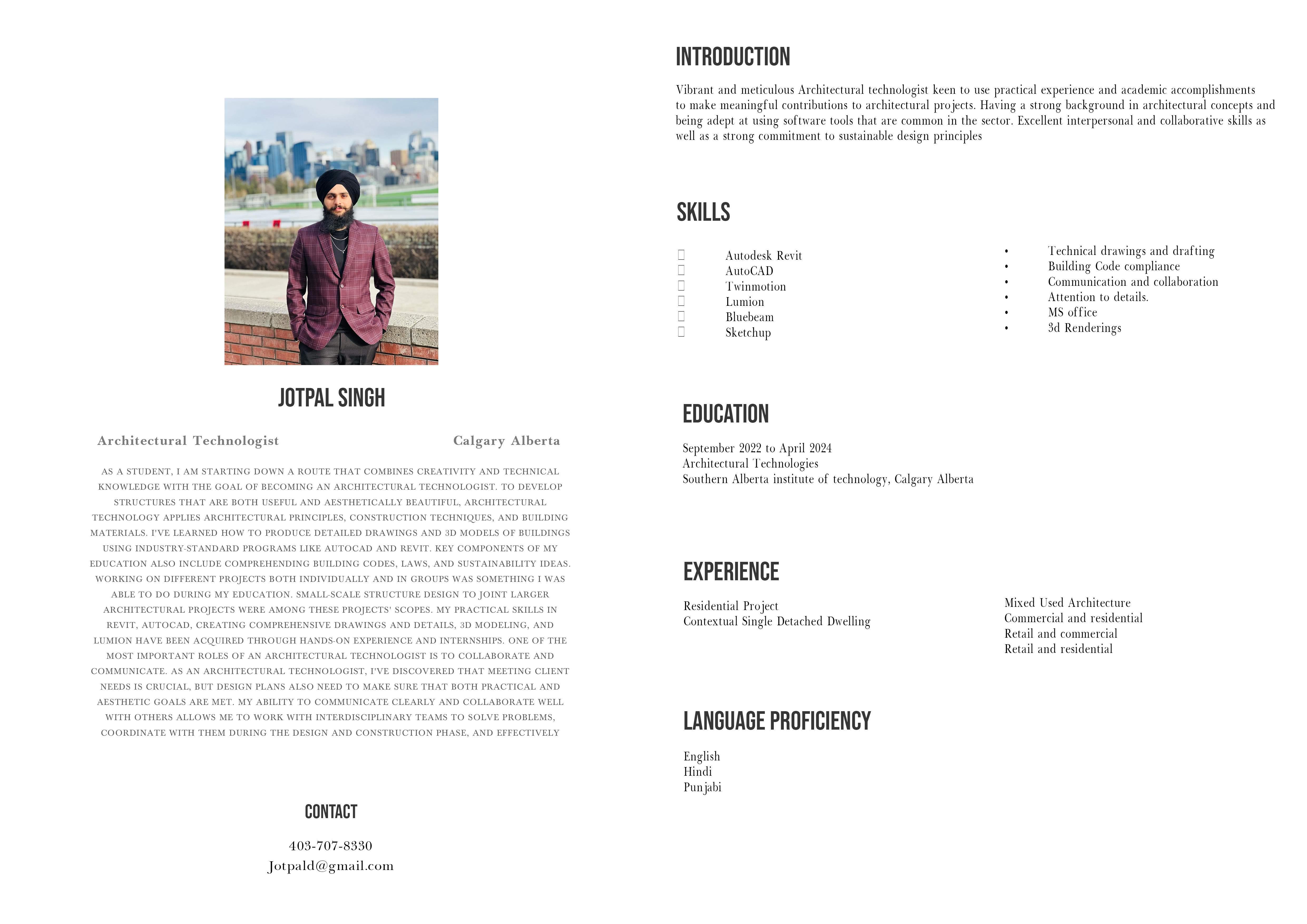 Greetings all, This is Jotpal Singh a vibrant and meticulous architectural technologist who recently graduated as Architectural Technologist from Sothern Alberta Institute of Technology .As a aspiring leaner I am keen to share my portfolio that showcases my attainments and journey so far.