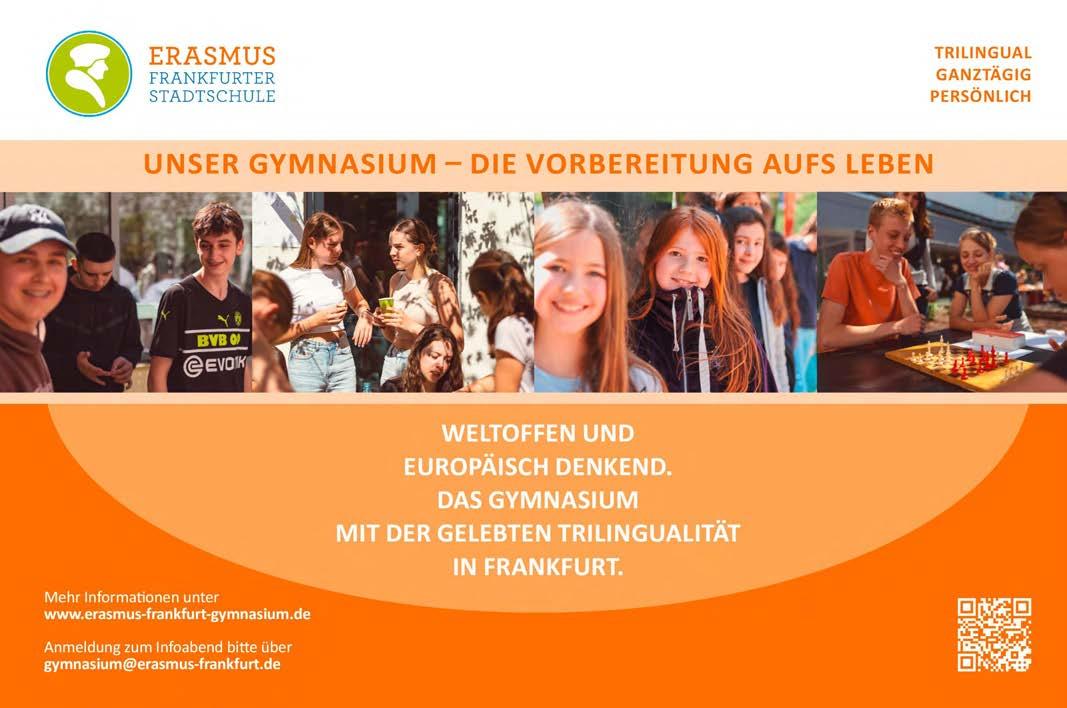 Ab der fün en Klasse begleitet die Erasmus Frankfurter Stadtschule ihre Schülerinnen und Schüler neun Jahre lang zum Abitur – ein Jahr mehr zum Lernen, aber auch zum Leben und Freiraum nehmen. Auch im Gymnasium steht die Trilingualität im Fokus. Nicht weniger wichtig ist für Pädagoginnen und Pädagogen der Erwerb von Fach-, Kommunikations-, Sozial-, Methoden- und Medienkompetenzen sowie ein demokratisch aktives Handeln im Umgang miteinander. Ab dem Schuljahr 2024/25 be ndet sich das Gymnasium nicht mehr an der Sonnemannstraße, sondern am Bildungscampus Heusenstamm. Mehr Informationen dazu und was sonst noch für den Standort geplant ist, erfahren Interessierte auf der Webseite der Erasmus Frankfurter Stadtschule. erasmus-frankfurt-gymnasium.de