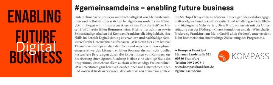 Auch wer das Wagnis „Selbstständigkeit“ eingegangen ist und damit wahrscheinlich schon seinen Traumberuf ausführt, kann immer wieder Neues lernen und sich weiterbilden. Ein niedrigschwelliges Angebot dafür hat Kompass Frankfurt entwickelt. Auf dem Instagram-Kanal „gemeinsamdeins“ können sich Selbständige mit kurzen Videos für zwischendurch schnell und ezient weiterbilden. „Geschä sbetreibende können beispielsweise nicht einfach ihren Laden schließen, um an einer Fortbildung teilzunehmen“, sagt Kompass-Geschä sführerin Ellen Bommersheim. „Zudem sind sie in ihren Anfangszeiten, aber auch später als etabliertes Unternehmen multidimensionalen Krisen ausgesetzt.