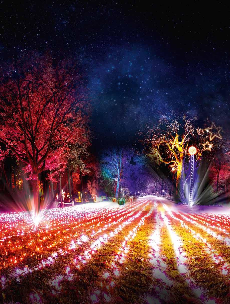 light an vielen Christmas Garden Standorten, erreicht im Christmas Garden Frankfurt ein sensationelles Ausmaß von 2.160 Quadratmetern mit insgesamt 43.200 zu Musik programmierten Leuchtdioden und wird für traumhafte Augenblicke sorgen. Der Weg ins Glück führt durch einen 15 Meter langen farbig funkelnden Lichttunnel, der seinen Besucher:innen ein Lächeln ins Gesicht zaubert. Mär chenhaft ragt eine sechs Meter hohe, weiß schimmernde Himmelsleiter bis in die Krone eines riesigen Baumes und scheint ins unendliche Firmament aus leuchtenden Sternen und einem strahlenden Mondball zu führen. Ein Farbenfest ist auf dem Regenbogenweg zu erleben: Auf 90 Metern Länge sind zu beiden Seiten des Wegs bunte LED-Schein werfer installiert, die das Publikum mit einem animierten Farbverlauf und Regenbogeneffekten faszinieren. Neben winterlichen Hütten mit genussvollen, weihnachtlichen Köstlichkeiten, steht auch in diesem Jahr ein nostalgisches Kettenkarussell bereit, über das sich wahrscheinlich nicht nur die Kleinsten freuen.