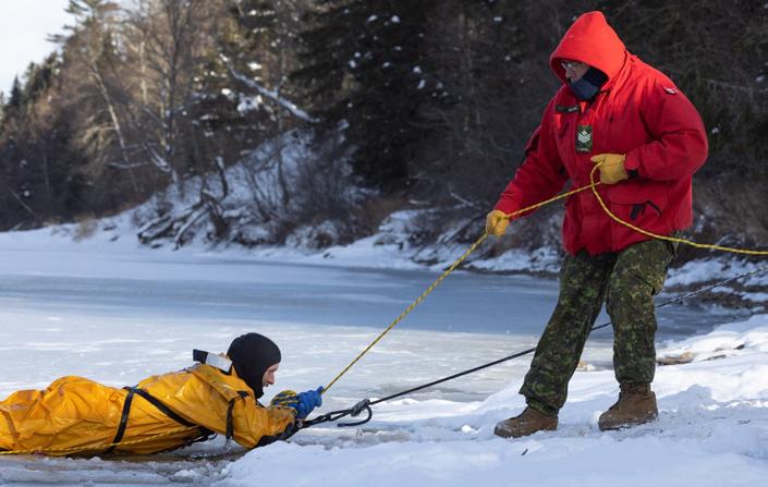 Sergent Gaston Bellefleur, de la Patrouille de Rangers canadiens de Unamen Shipu, perfectionne ses techniques de sauvetage en eau froide.