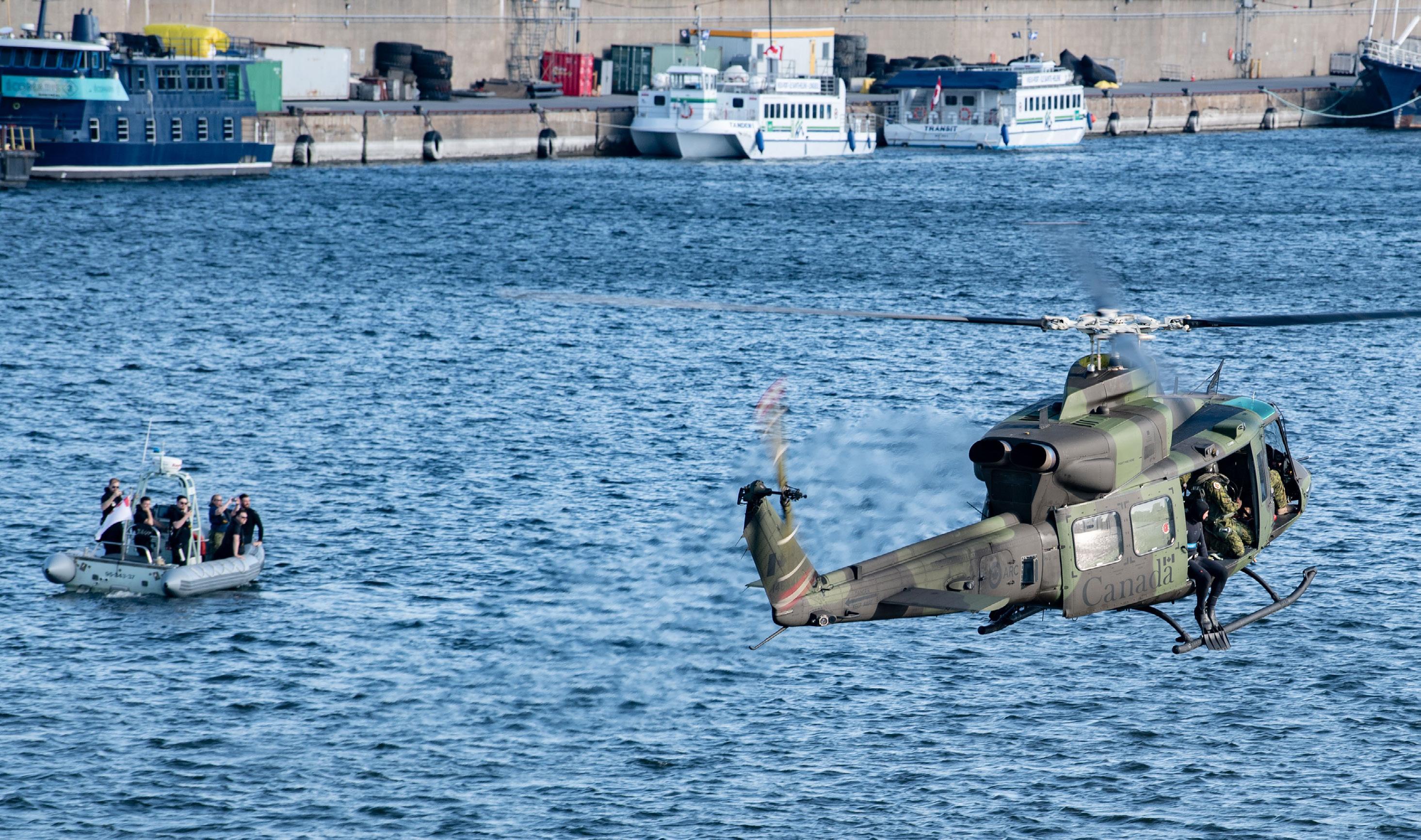 From 4 p.m. to 7 p.m., three CH-146 Griffon helicopters from 438 THS made three round trips between the Saint-Hubert airport and the Old Port of Montreal to drop divers from HMCS Donnacona. “Divers from the Naval Reserve unit jumped into the cold water of the St. Lawrence River to perform underwater maneuvers. Boats were present to collect them,” explains Captain Frédérique Rousseau, public affairs officer of the 438 THS.