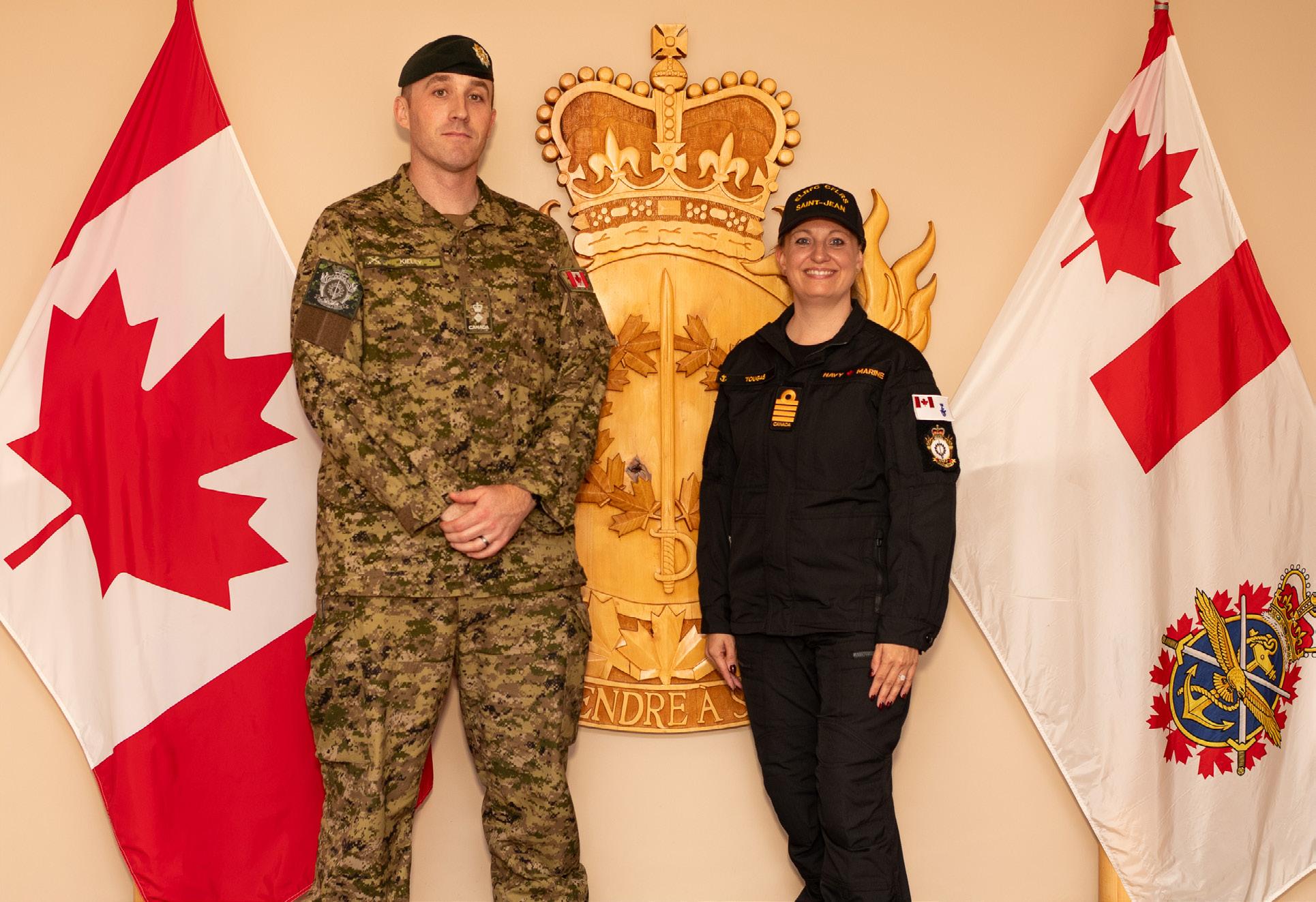 Capitaine de vaisseau honoraire Véronique Tougas pose fièrement avec le commandant de l’École de leadership et de recrues des Forces canadiennes, lieutenant-colonel Marc Kieley.