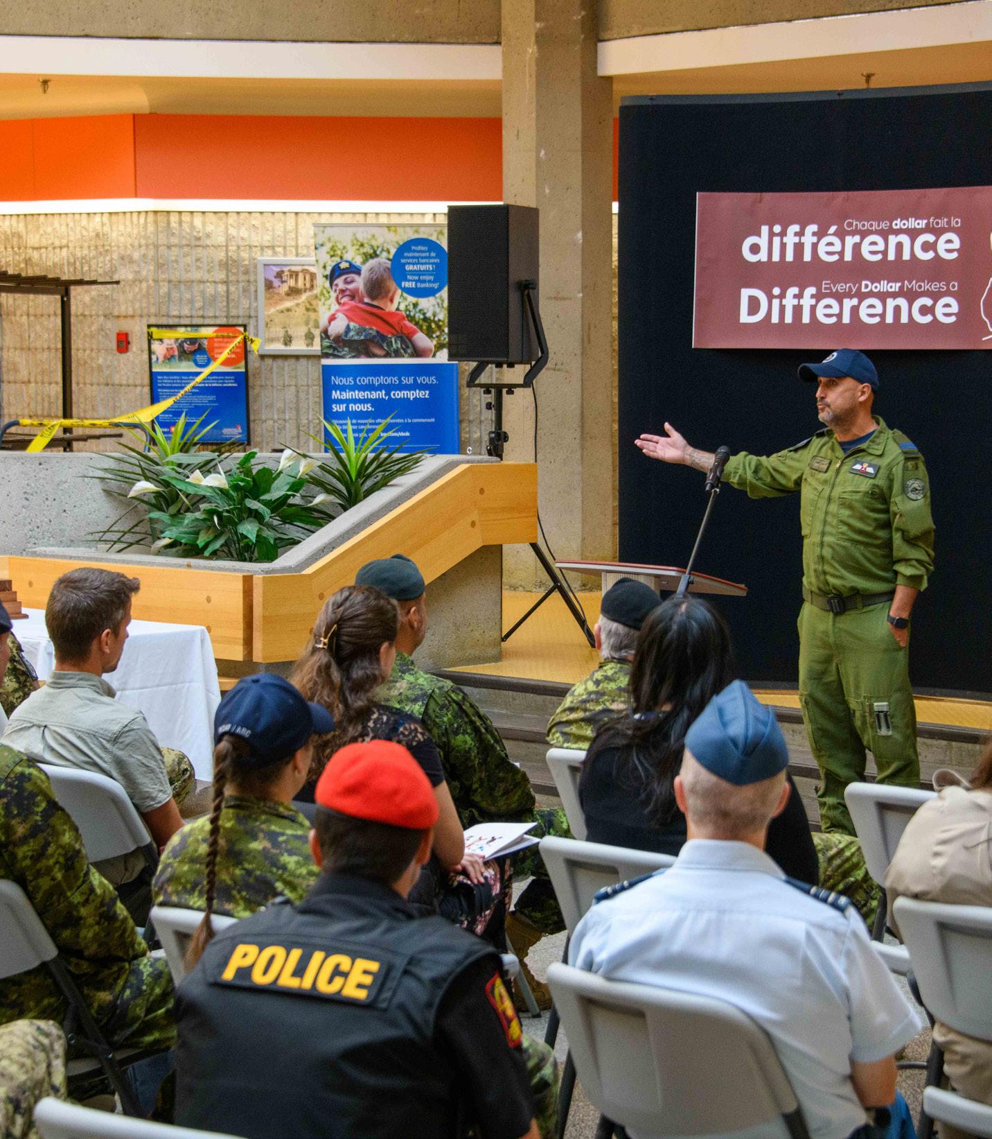 Adjudant Dominic Veilleux (à droite), adjudant des opérations à l’École de leadership et de recrues des Forces canadiennes, discute avec des visiteurs.