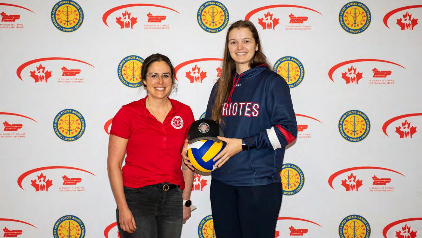 Sergente Frédérique Goulet du 34 e Régiment des transmissions a été nommée joueuse la plus utile du championnat pour les Patriotes. Elle est en compagnie de Vanessa Mc Alpine, coordonnatrice des sports militaires.