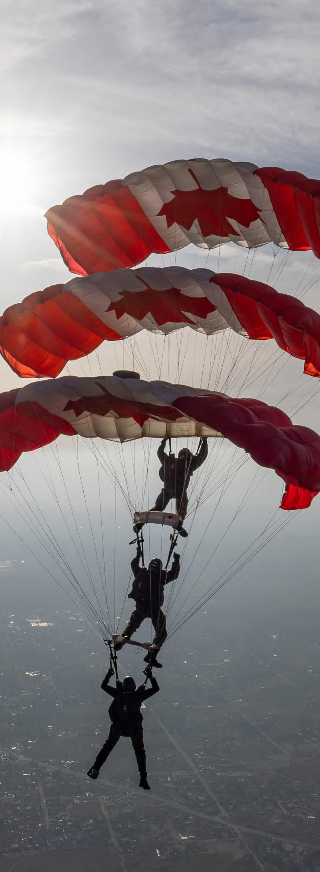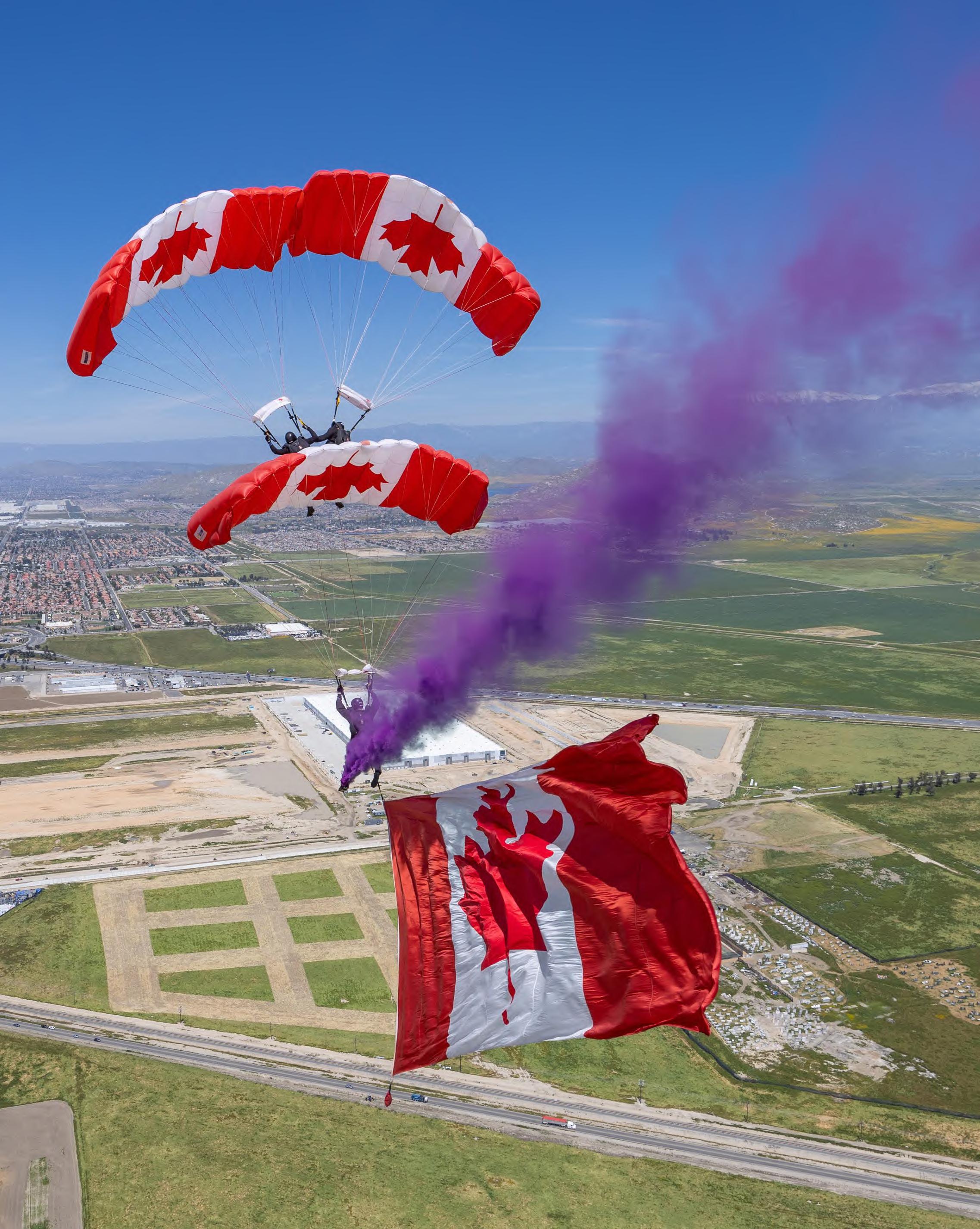 Le militaire raconte que l’équipe est formée de 14 parachutistes qui s’en donnent à cœur joie à effectuer des acrobaties après avoir fait un saut à une hauteur de 6 000 pieds. Le Canadian T est l’une des figures auxquelles il participe. « Je suis l’un des premiers à sauter avec le drapeau canadien. Deux autres parachutistes me suivent. Ils se retrouvent juste un peu au-dessus de moi. Avec le gaz fumigène, nous réussissons à créer la lettre T. »