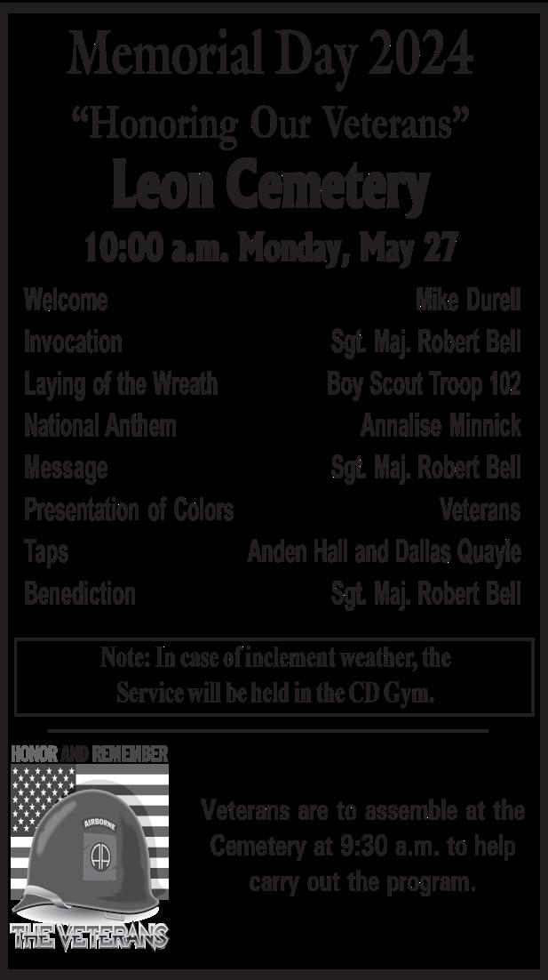 In preparation for Memorial Day 2024, the avenue of flags and white crosses will be put out at the Leon Cemetery on Thursday, May 23. Anyone wishing to help, meet at the Leon Cemetery around 8:30 a.m. Memorial Day services will be held at 10:00 a.m. on Monday, May 27. Speaker will be Sgt. Major Robert Bell.