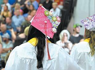 Fifty-two Central Decatur seniors walked across the stage this past Sunday afternoon and received their diplomas, signifying the closing of one chapter and opening a new one. Above, Dean Layton gave a "thumbs up" as he is joined by his classmates following the graduation ceremonies that were held in the high school. At the right, Aniston Jones left words of wisdom for her classmates on her mortar board..."I said, remember this moment."