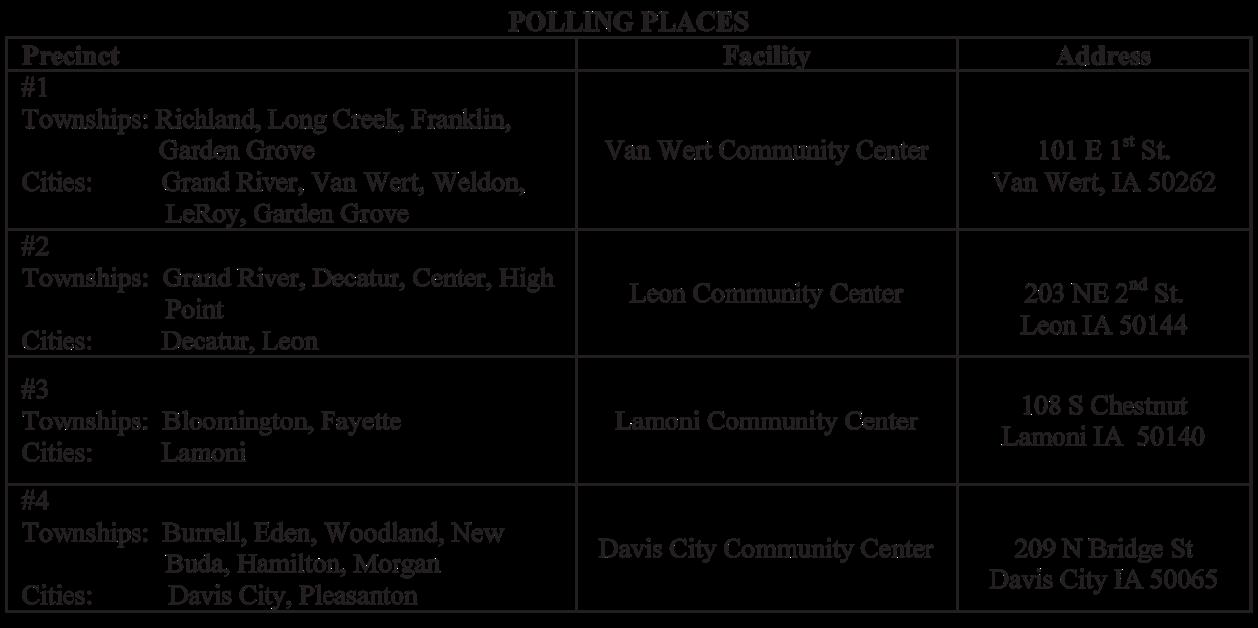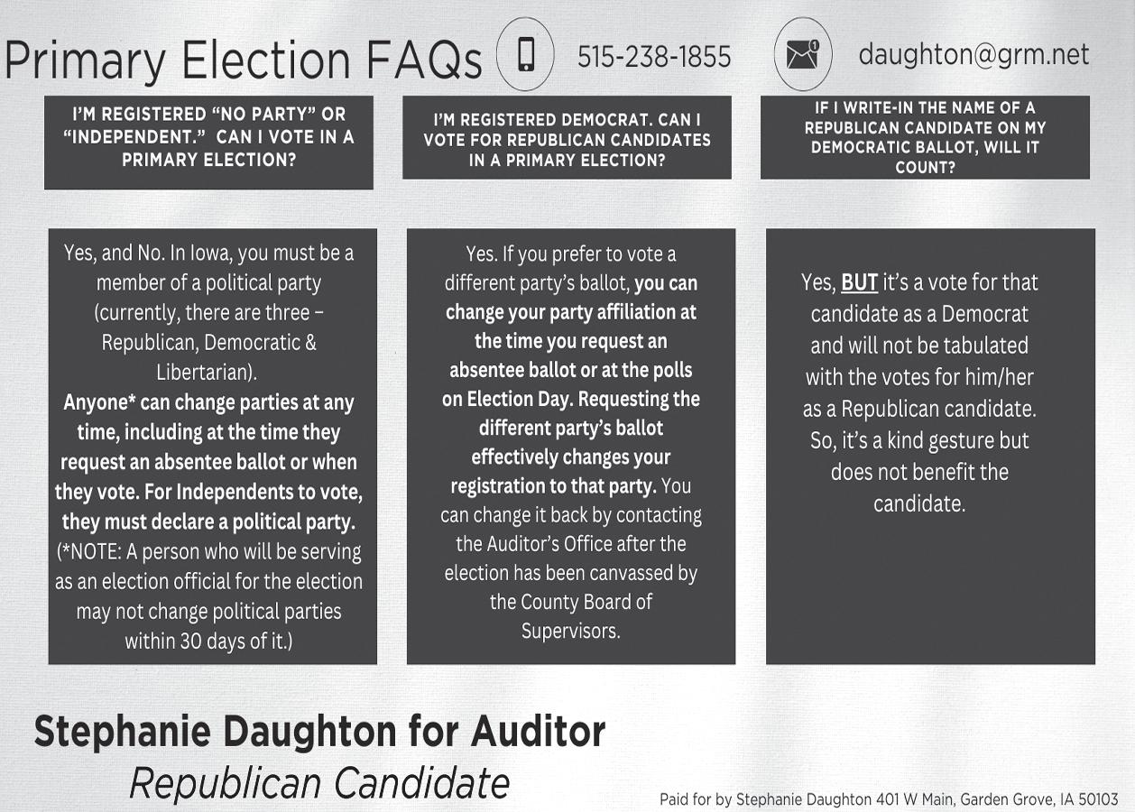 For more information about the Primary Election, please visit the county’s website: www. decaturcountyiowa.org. or contact the County Auditor’s office at 641-446-4323.