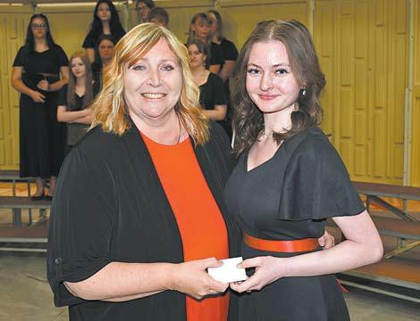 Mrs. Beth Hall, CD Vocal Instructor, presents Delaney Brown, right, with the Arion Award.