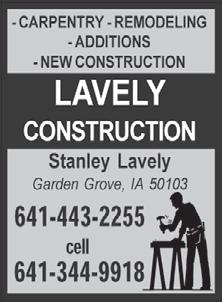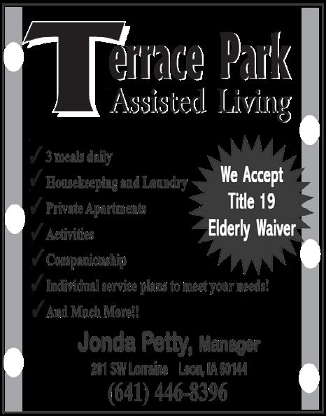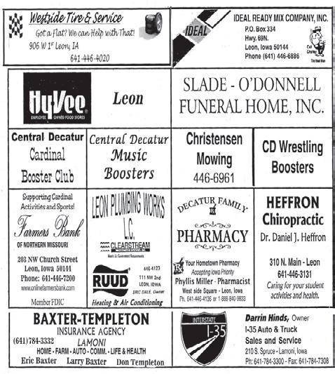 Cassie Martin Licensed Esthetician 641-289-0124 Leon/Creston, Iowa @cmesthetics2023 cmesthetics2023@gmail.com ● Facials ● Waxing ● Spray Tanning RENEE CASSITY Office Manager Michael Banks Agency 102 W. 1st Street - Leon 641-800-7126 PCassity@AmFam.com Southern Iowa Towing & Recovery 641-784-4551 2050 E. Main St Lamoni, IA Call us today to schedule your maintenance or repair! We are your one stop shop. Where you can count on professional and honest services in a small town friendly environment. WE KNOW HOW IMPORTANT YOUR VEHICLE IS TO YOU! We are offering services on light to heavy duty vehicles with very competitive pricing. ● Oil changes, Tune Ups, Maintenance and Repairs on anything from small passenger cars all the way up to semis and semi trailers. ● New and Used passenger tires ● Tire repairs ● Annual DOT Inspections ● New, Used and Recap Semi Tires (continued from page 1) Hours: 8 a.m. to 5 p.m. Mon. - Sat. CLOSED: Sundays 641-446-4778 Decatur Diamond Coffee Open Every Weekend Fridays & Saturdays 8 a.m. - 5 p.m. Thru Memorial Day Weekend ● Bulk Garden Seed ● Seed Potatoes ● Onion Sets ● Early Bedding Plants ● Air Plants and Terrariums ● Succulents and House Plants ● Fertilizers ● Gardening Accessories LUNCH SPECIAL Saturday, May 25 SMASH BURGERS OPEN Memorial Day May 27 8 a.m. - Noon LTsautobody.IA@gmail.com Tracy Eivins Lyal Whirrett ● Minor Mechanical Repairs ●Restoration ●Auto Collision Repair ●Sand Blasting ●Aftermarket Accessories & Installation ●Tractor Repair www.gilberthomecomfort.com 19563 Hwy 69 North, Leon, IA 641-446-4822 Plumbing Electrical Heating & Cooling Spray Foam DCH Corner