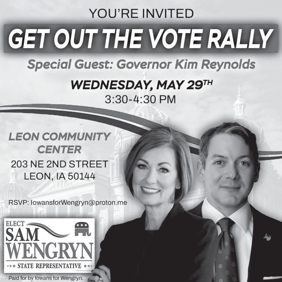 sentative Joel Fry. Join the rally May 29, from 3:30 to 4:30 PM at the Leon Community Center, located at 203 NE 2nd Street, Leon, IA 50144. With deep roots in Decatur County, Wengryn's dedication to serving his community is unparalleled. As Chair of the County