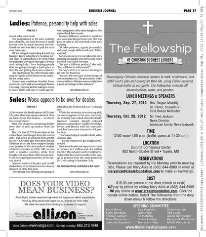 2009, we saw the bankruptcies of GM and Chrysler, that was unprecedented. Now we have about 150 dealers. ... so there’s less competition.” After that shakeout, remaining dealers were able to pick up market share, he said. The U.S. had 17,770 dealerships at the end of June, unchanged from the end of 2011, but down 15 percent from 20,985 in 2007. Chrysler and President Barack Obama’s auto task force stripped nearly one-quarter of the automaker’s dealers of their franchises in 2009. GM cut ties with a smaller number, while Ford bought out more than 100 Lincoln dealers in its ongoing reinvention of the luxury brand. Lehman said six Chrysler and 14 GM dealerships were either forced to close or The Associated Press contributed to this report. decided to close that year. “Everything was blowing and going in dennis.seid@journalinc.com