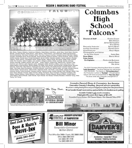 Directors & Staff . . . . . . . . . . . Charles Cooper . . . . . . . . . . . . . . . . . . . . . . . . . . . . Billie Dickson . . . . . . . . . . . . . . . . . . . . . . James Merriweather . . . . . . . . . . . . . . . . . . . . . . . . . . . . Erica Shirley Percussion Instructor . . . . . . . . . Sammy Brown Auxiliary Coordinator . . . . . . . . . . Pamela Colvin Guard Instructor . . . . . . . . . . . . . . Shaun Hayes Choreographer and Advisor for the Color Guard . . . . . . . . . . . . . Nadia Dale Drum Major . . . . . . . . . . . . . . . . . Bianca Wood Color Guard Co-Captains . . . . . . . . . Pershunda Buchanan . . . . . . . . . . . . . . . . . . . . . . . . . . . Jessika Hayes . . . . . . . . . . . . . . . . . . . . . . . . . . . . . . Mai Jones The 2010 Columbus Marching Band Show is entitled “Latin Sensation”. The show features four well-known Latin Standards. The Opener is “El Cumbanchero”, the Production number is “Perfidia”. The percussion feature with band accompaniment is “Ran Kan Kan”. The show ends with a dramatic arrangement of “Brazil”.