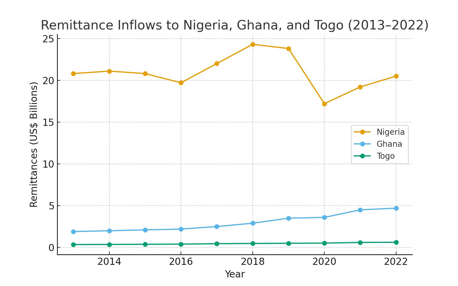 Figure 1: Remittance inflows to Nigeria, Ghana, and Togo (2013–2022).