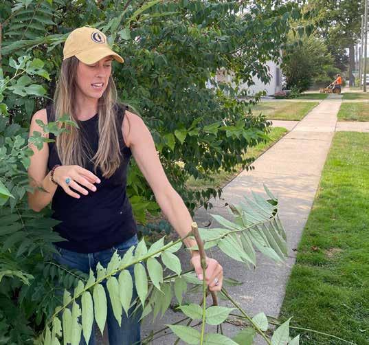 Marie McCormick, executive director of Friends of the Rouge, holds a branch from a Tree of Heaven that is crowding out a local sidewalk.