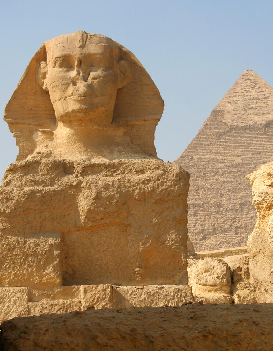 Not far from the Pyramids is the Great Sphinx of Giza, which dates back to the time of Chephren (2620 BC). Hewn from natural yellowish limestone and standing 65 feet-high and 187 feet-long, this unforgettable statue combines the head of a Pharaoh with a lion's body. The face of the Sphinx closely resembles that of King Kephren.