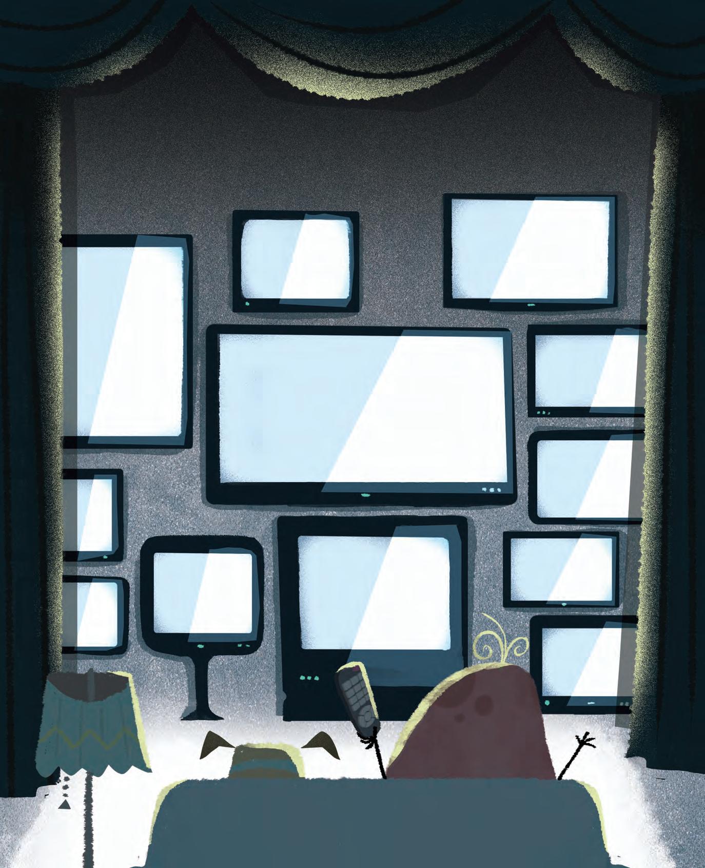Видите ли шта се налази испред мене? Погледајте добро. Спектакуларно, зар не? Да, да! Мноштво бљештавих екрана од зида до зида. Каква лепота! Каква радост! Каква дивота!