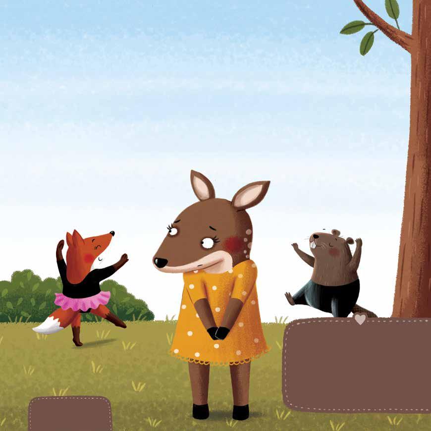 Маленој срни је било тешко да настави да се буни, па је овог пута ипак одабрала да буде послушна и оде на плес. И у наредним данима срна је бојажљиво и тихо говорила мами да не жели да иде на плес. Правдала се да је уморна, да нема времена јер мора напамет да научи песмицу или да је боли стомак.