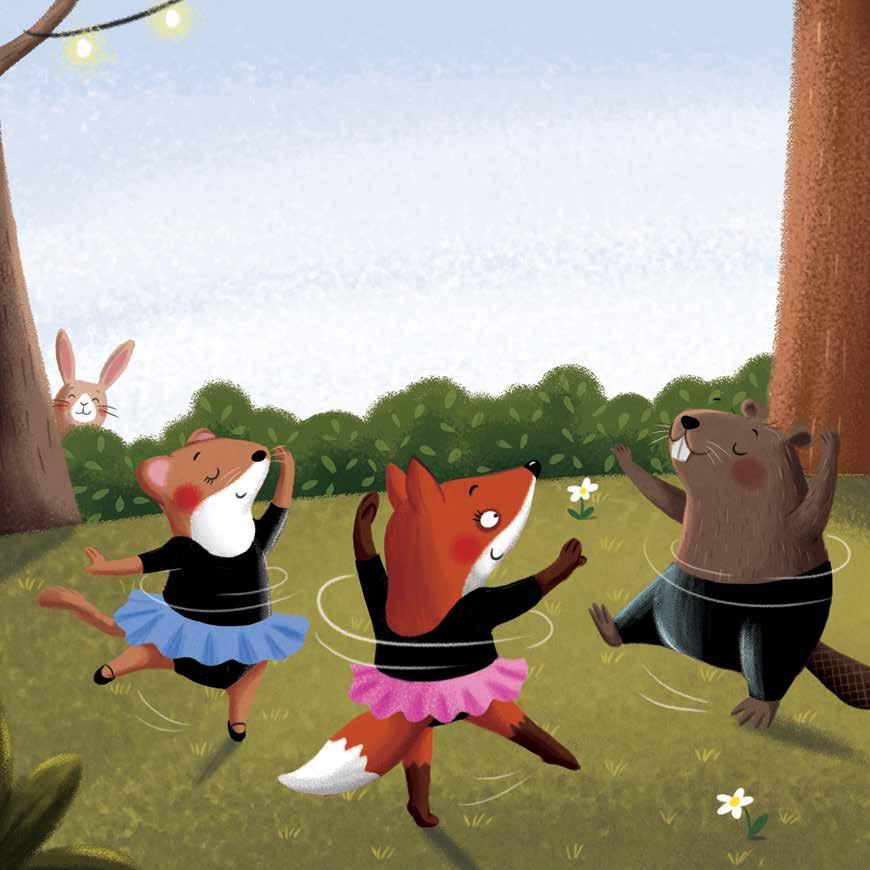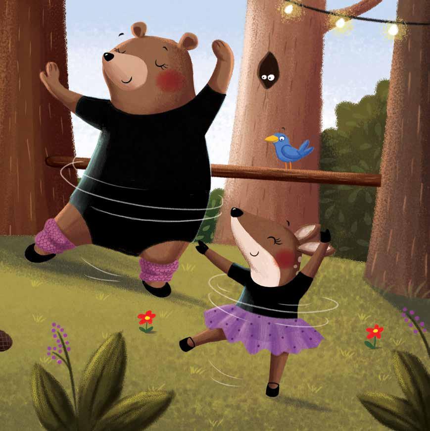 – Мама, мама, је л‘ данас идем на плес? – скоро сваког дана питала је малена срна. Одувек је јако волела да плеше, па су је родитељи уписали у школу плеса. У њеној групи плесале су њене другарице лисица и ласица, и другари дабар и рис. Новим плесним покретима учила их је њихова инструкторка плеса, шумска медведица. Срна је научила разне нове плесне кораке, које је затим код куће показивала мами и тати. Баш је уживала да весело скакуће уз музику, врти се око себе и замишља да плеше на некој великој позорници. – Оооо, па сјајно ти иде! Какав окрет! Баш се много трудиш и уживаш –охрабривали