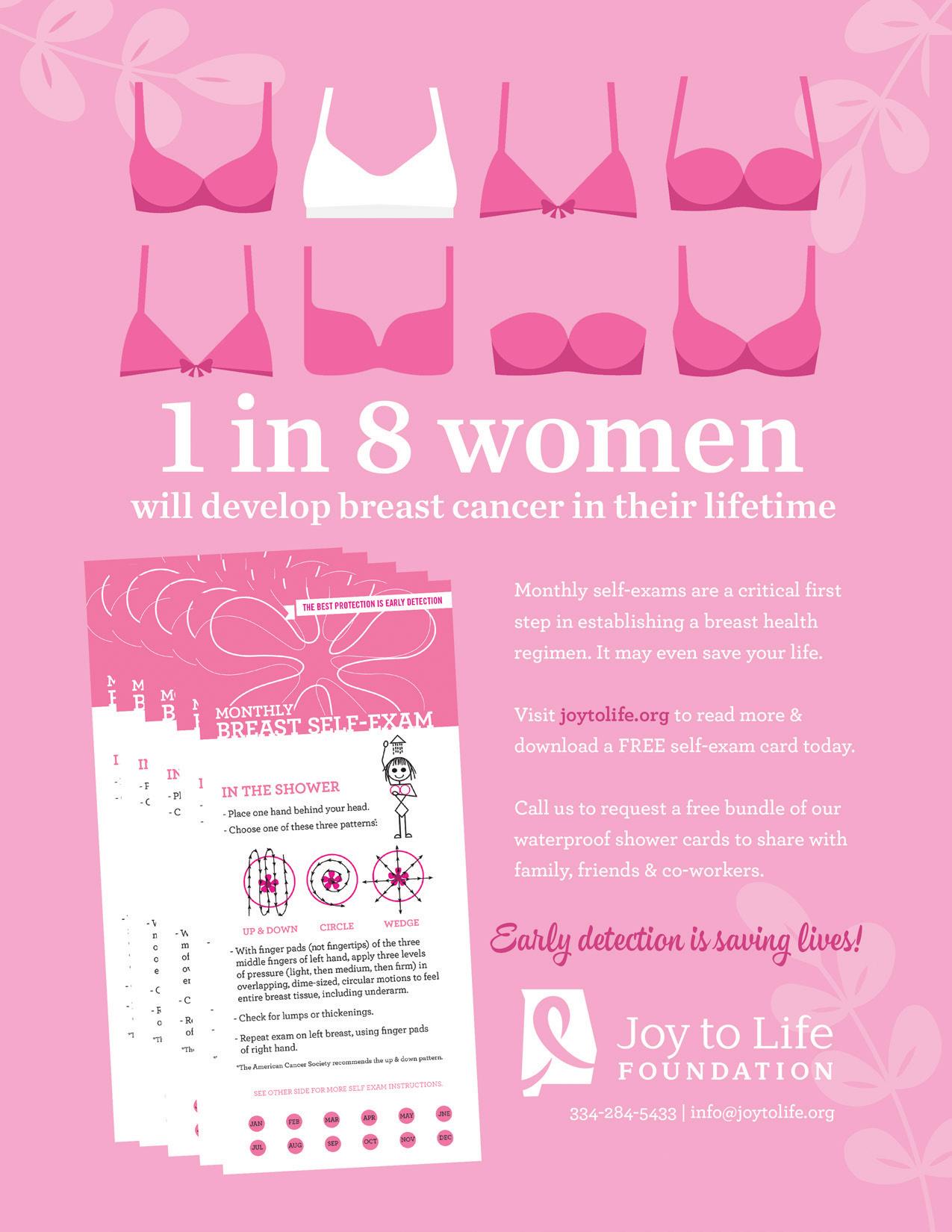 have breast cancer. Joy to Life is the only organization in Alabama that will provide funding for a man to be screened. Finally, the Foundation has greatly increased awareness of breast cancer in general and the importance of regular mammograms and screenings throughout the state.