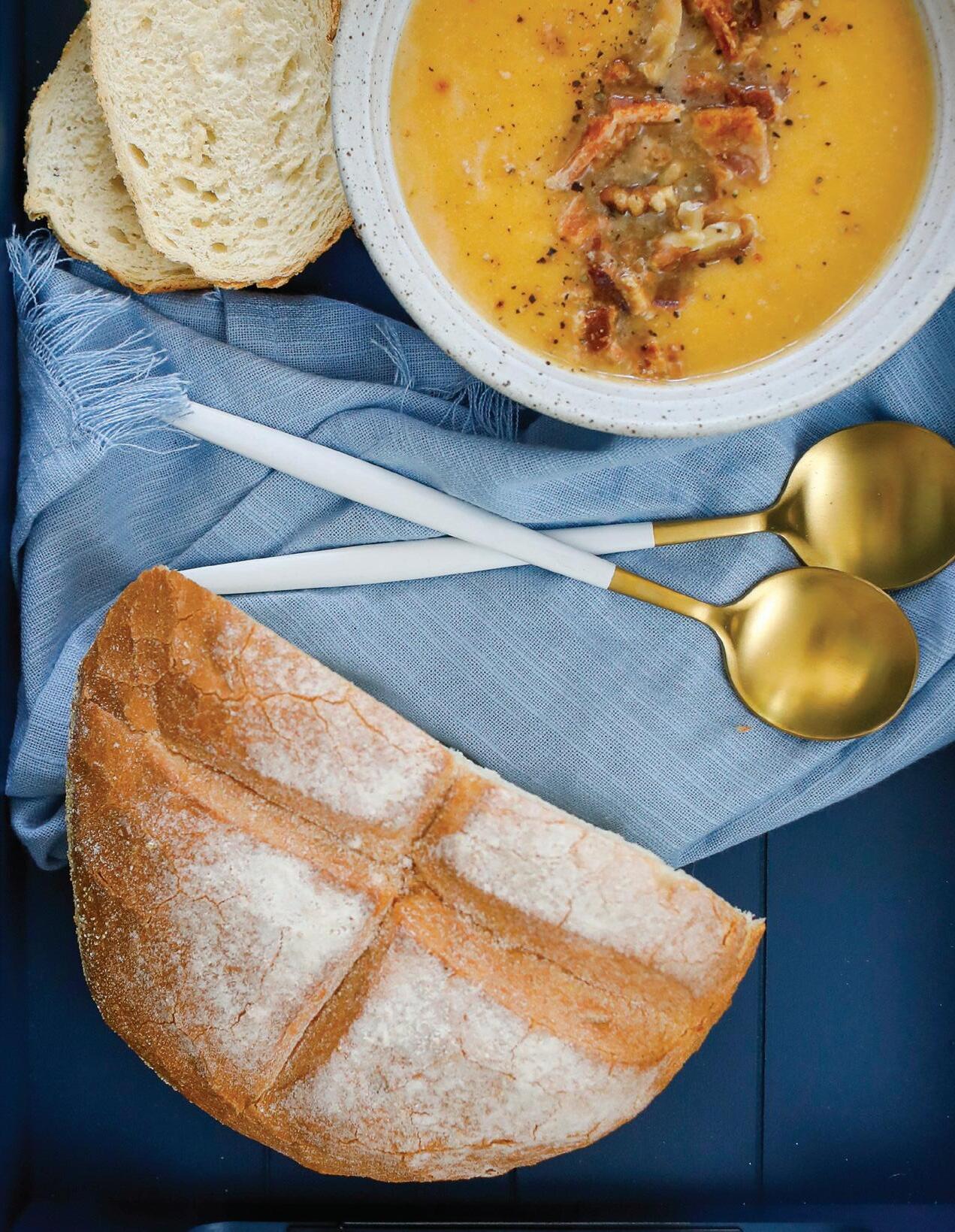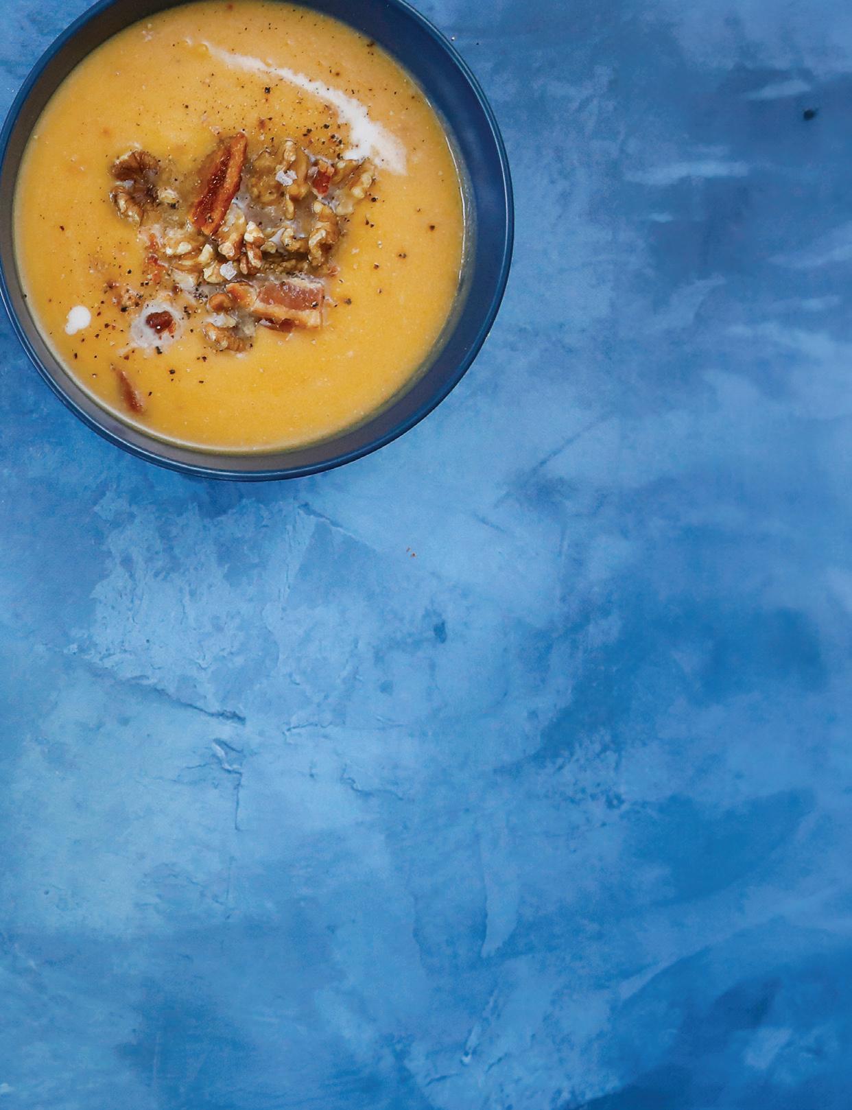 Most rich and hearty soups are loaded with cheese and heavy cream, but not this one. The soft, silky squash is blended with roasted garlic and toasted walnuts, then finished with a touch of coconut milk. Crisp bacon and more walnuts add the perfect crispcrunchy finish.