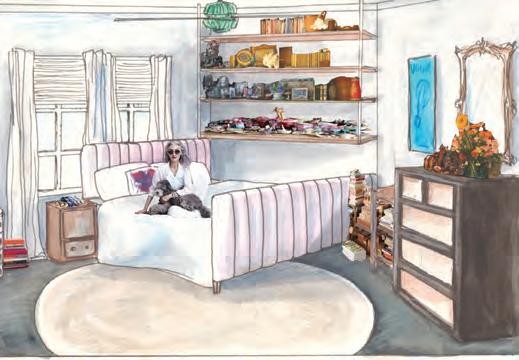 i designed a custom/personal condominium for famous stylist and model Linda Rodin. this space is eclectic and colorful with plenty of opportunities for comfort and customization for her lifestyle and aesthetic. the space appreciates and allows for her tendency to collect things and be sentimental and enhance her neoteric mindset while inviting her and her beloved pup Winky into a safe space to unwind.