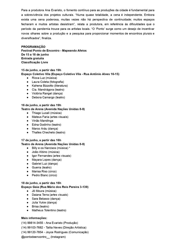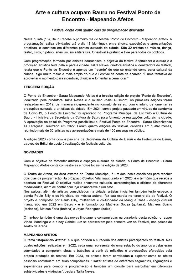 O release "Arte e cultura ocupam Bauru no Festival Ponto de Encontro - Mapeando Afetos" foi construido contendo as principais informações: