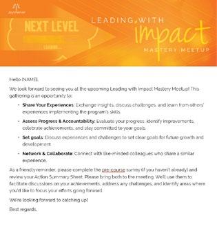 • Comprehensive, Automated, Email Communication Series: Over 25 pre-crafted messages, including pre-meeting teasers, postmeeting follow-ups and Wednesday Wisdom messages to maintain concept retention.
