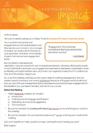 Leveraging Joychiever’s Hierarchy of Engagement, the Leading with Impact program is an innovative, one-year learning experience, designed to revolutionize how partners manage to sustainably drive success for the firm.