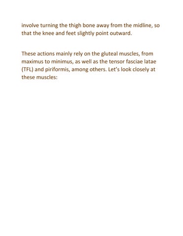 involve turning the thigh bone away from the midline, so that the knee and feet slightly point outward. These actions mainly rely on the gluteal muscles, from maximus to minimus, as well as the tensor fasciae latae (TFL) and piriformis, among others. Let’s look closely at these muscles: