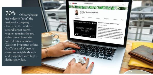 of homebuyers use video to “tour” the inside of a property. YouTube, the world’s second-largest search engine, remains the top video research website for real estate searches Westcott Properties utilizes YouTube and Vimeo to showcase neighborhoods and properties with high – definition video.