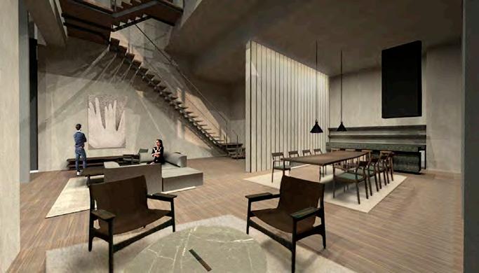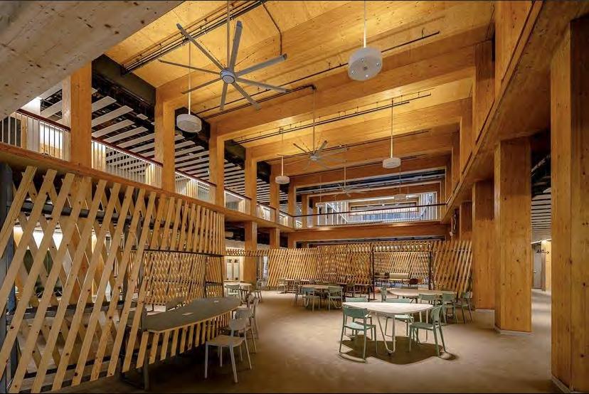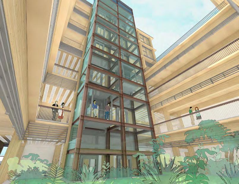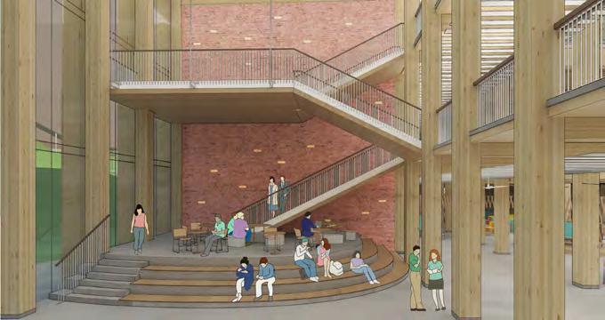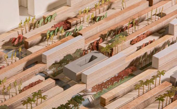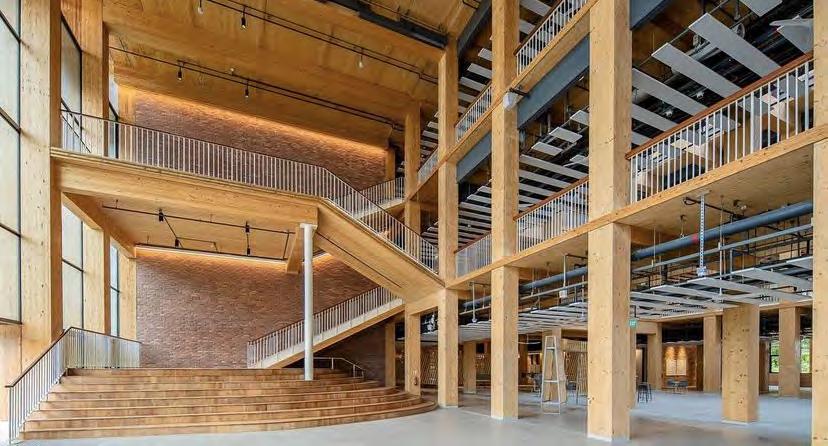 The central atrium and main event space are at the core of our building. Situated on the main transverse axis that passes through the building (E-W) these two spaces invite visitors in together to mingle, collaborate and relax. Some of the main features of this event space is the front entrance canopy and the grand staircase and the cascade water amphitheater at the back side of the building. The entrance canopy is meant to showcase structural timber and CLT in the same way the building does, welcoming in people with its curved form. The grand staircase is a stage and a collaborative platform. It reinforces the wooden nature of the building by showcasing CLT as the main structural element.